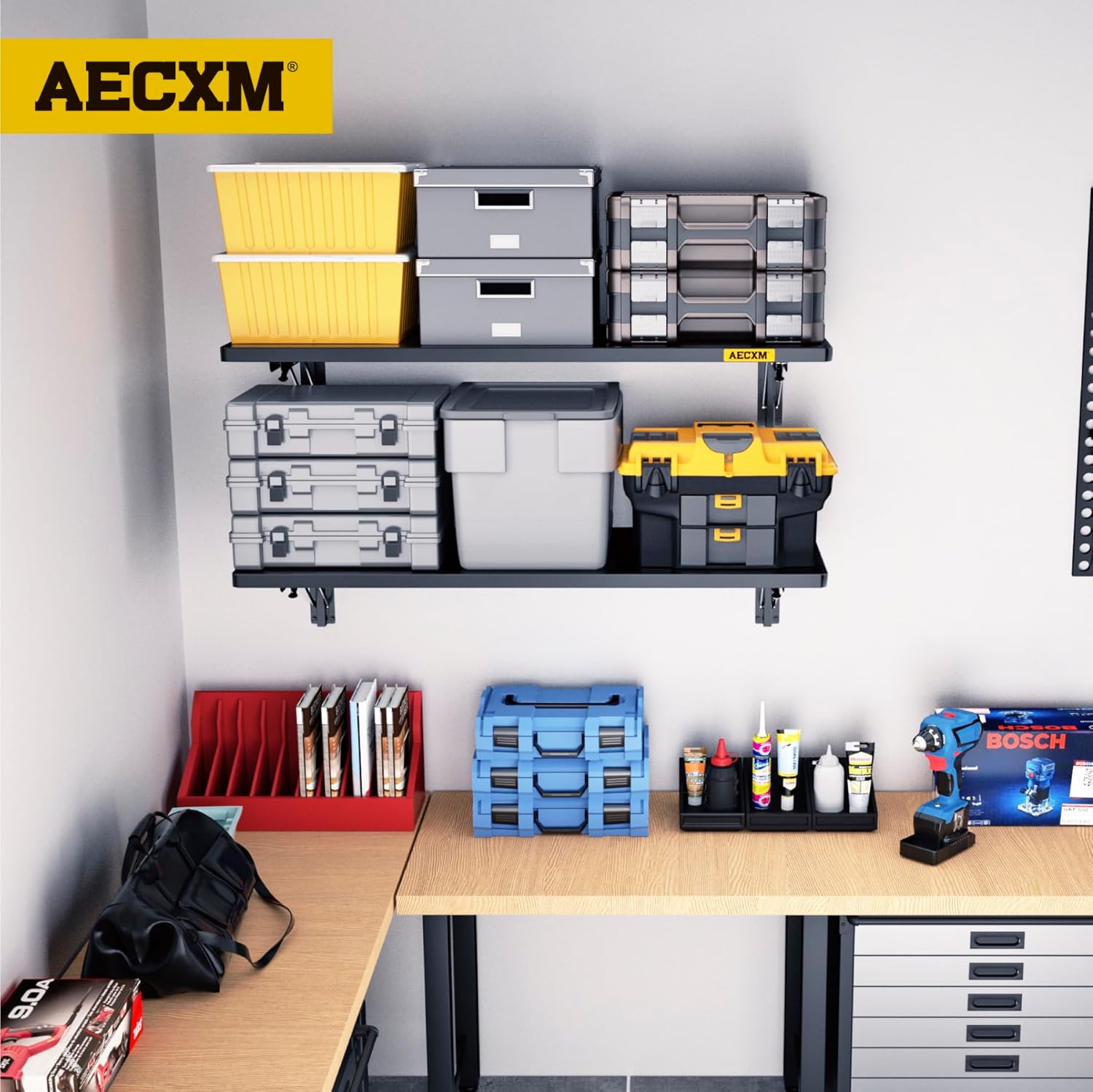 • SUPERIOR DESIGN: The foldable garage storage shelf panel is made of whole steel plate, The surface of matte high temperature powder baking paint, Flat and smooth, Panel with sliding rail design, The bracket can be installed freely in the range of 12"-45" spacing of wood wall keel, And at the same time it adopts folding bracket, Which can be freely stowed away or unfolded.