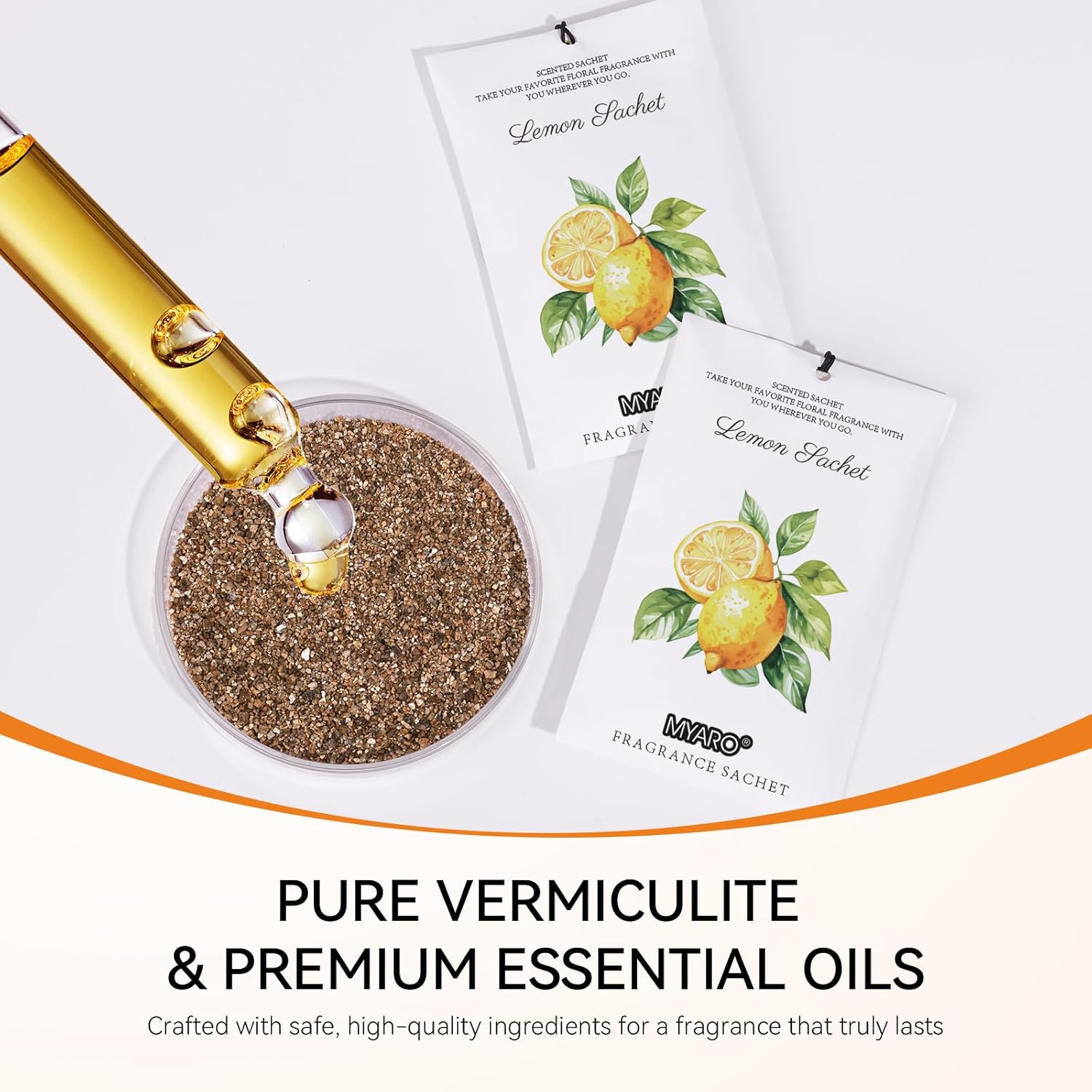 • MYARO Lemon Sachet Bags: Includes 12 scented sachets (each bag size: 4.13 inch x 2.76 inch). Our natural fragrance will take you on a journey with the fresh scents sachet packets