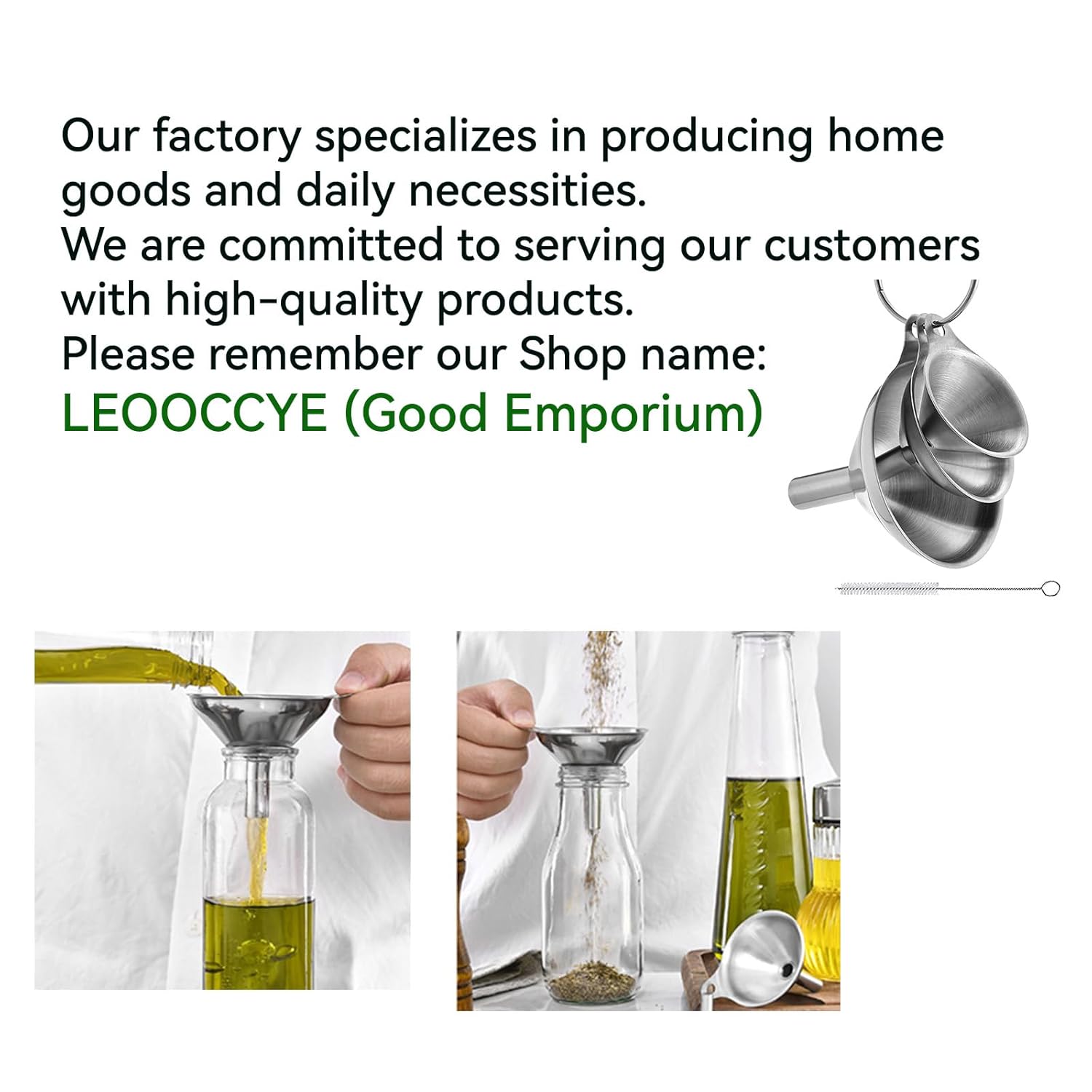 • They do not take up space, are easy to store and clean, and can be washed in a dishwasher or with the included long-handled brush. They are very convenient to use. The three funnels are strung together with a ring and can be stacked together or hung in a suitable place, only taking up a small amount of space.