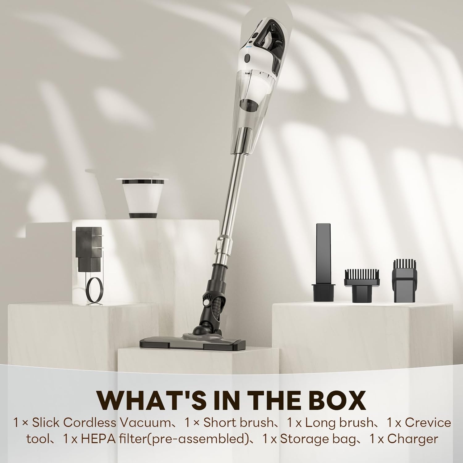 • Included Components : 1x Stick Cordless Vacuum; 1x Short brush; 1x Long brush; 1 x Crevice tool; 1 x HEPA fitertpre-assembled; 1x Storage bag; 1 x Charger 1x Stick Cordless Vacuum; 1x Short brush; 1x Long brush; 1 x Crevice tool; 1 x HEPA fitertpre-assembled; 1x Storage bag; 1 x Charger