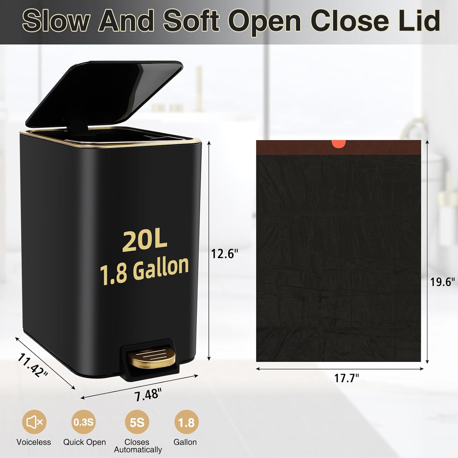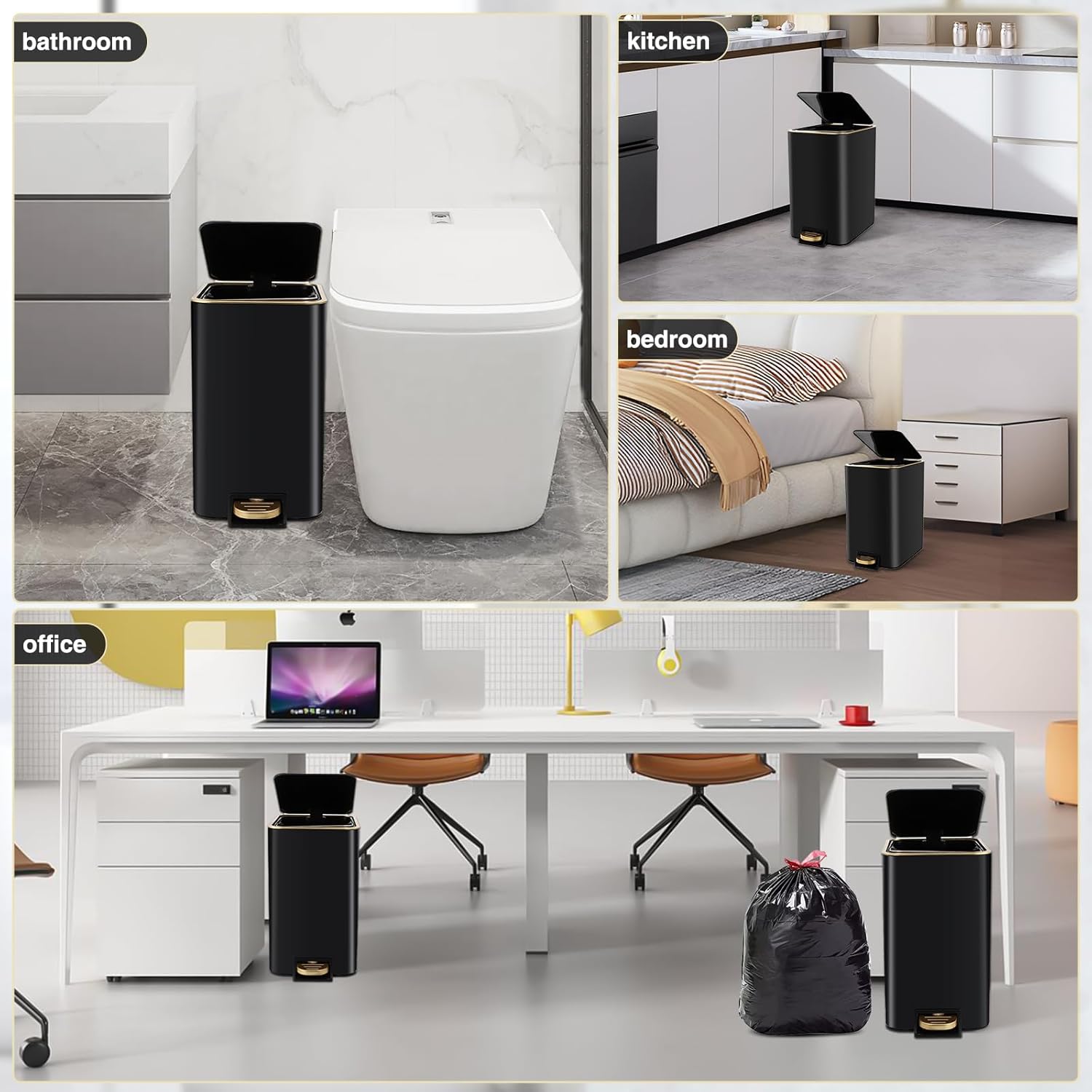 • [Package Included]:Trash can,80 Count 5 Gallon Trash Bag,6 Waterproof Tags. each accessory is carefully selected to meet your daily needs.Our black and gold bathroom set is not only practical but also beautiful, making your bathroom space more neat and comfortable