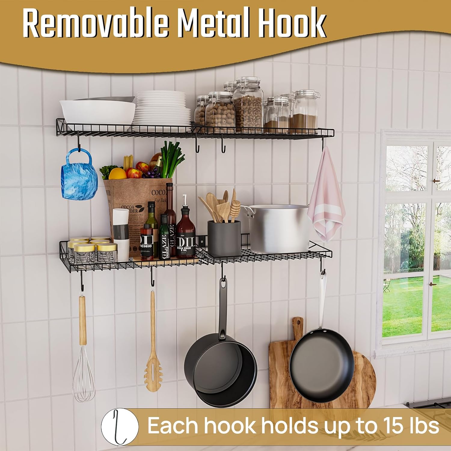 4 Pack Garage Wall Shelf, Garage Wall Mounted Shelving, Heavy Duty Floating Shelves With 8 Hooks, Loads 180 LBS Black Wall Shelves Mesh Storage Rack for Office, Basement, Wall Cabinet and Kitchen