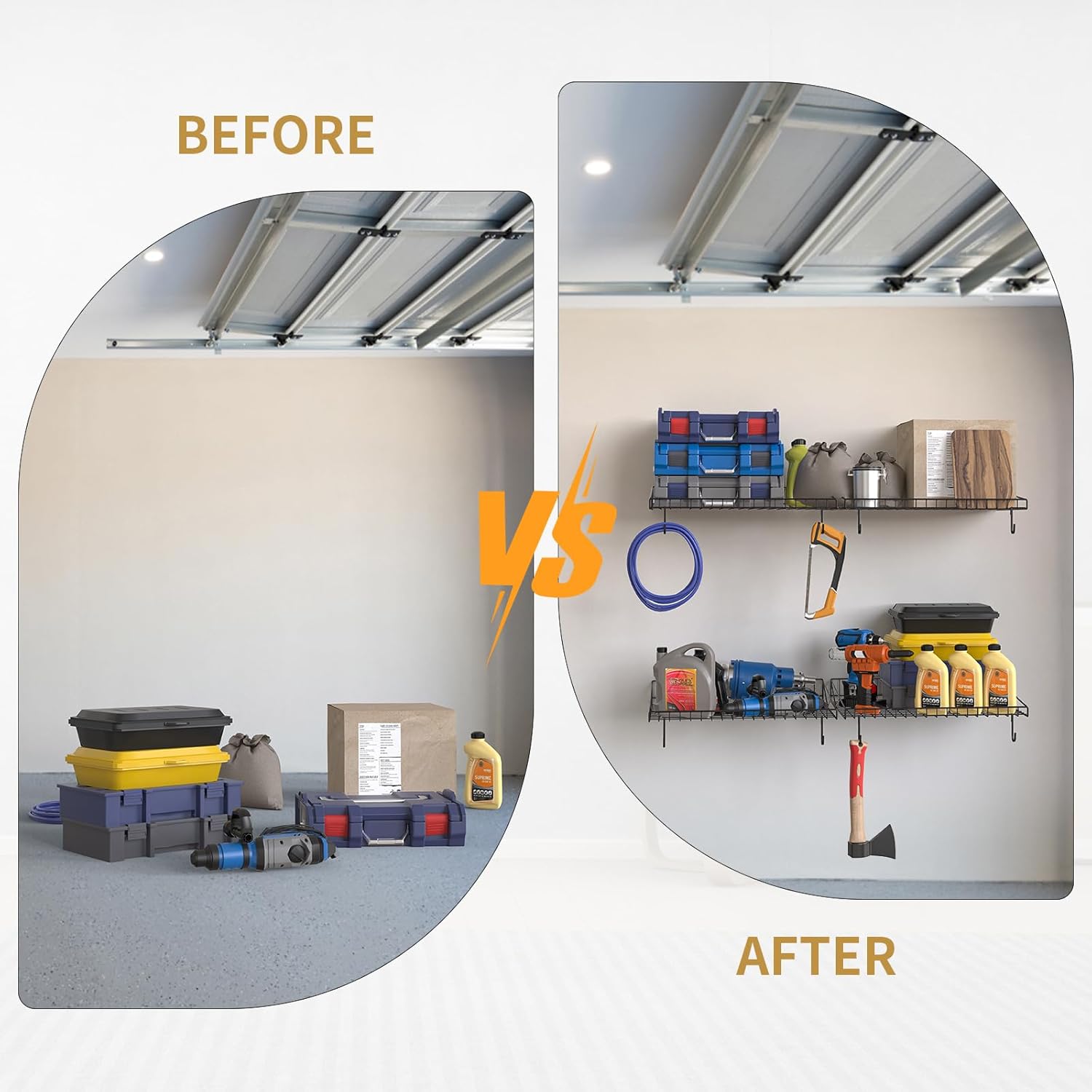 • HEAVY DUTY METAL WALL SHELF: Hanging Garage Wall Shelf is made of high-quality steel with a powder-coated finish for a sturdy structure. After extensive load-bearing testing, each metal rack has a load-bearing extent of 45 pounds, and 4 metal racks have a load-bearing extent of 180 pounds, providing a sturdy and secure storage solution for your valuables.