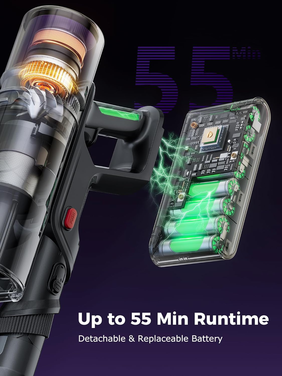 • 【55-Mins Runtime with Real-Time Countdown】The P16 cordless vacuum cleaner comes with detachable 2,200 mAh *8 battery packs, providing up to 55 minutes of runtime on a single charge! Monitor remaining time for each mode on the digital LED screen—no more battery anxiety