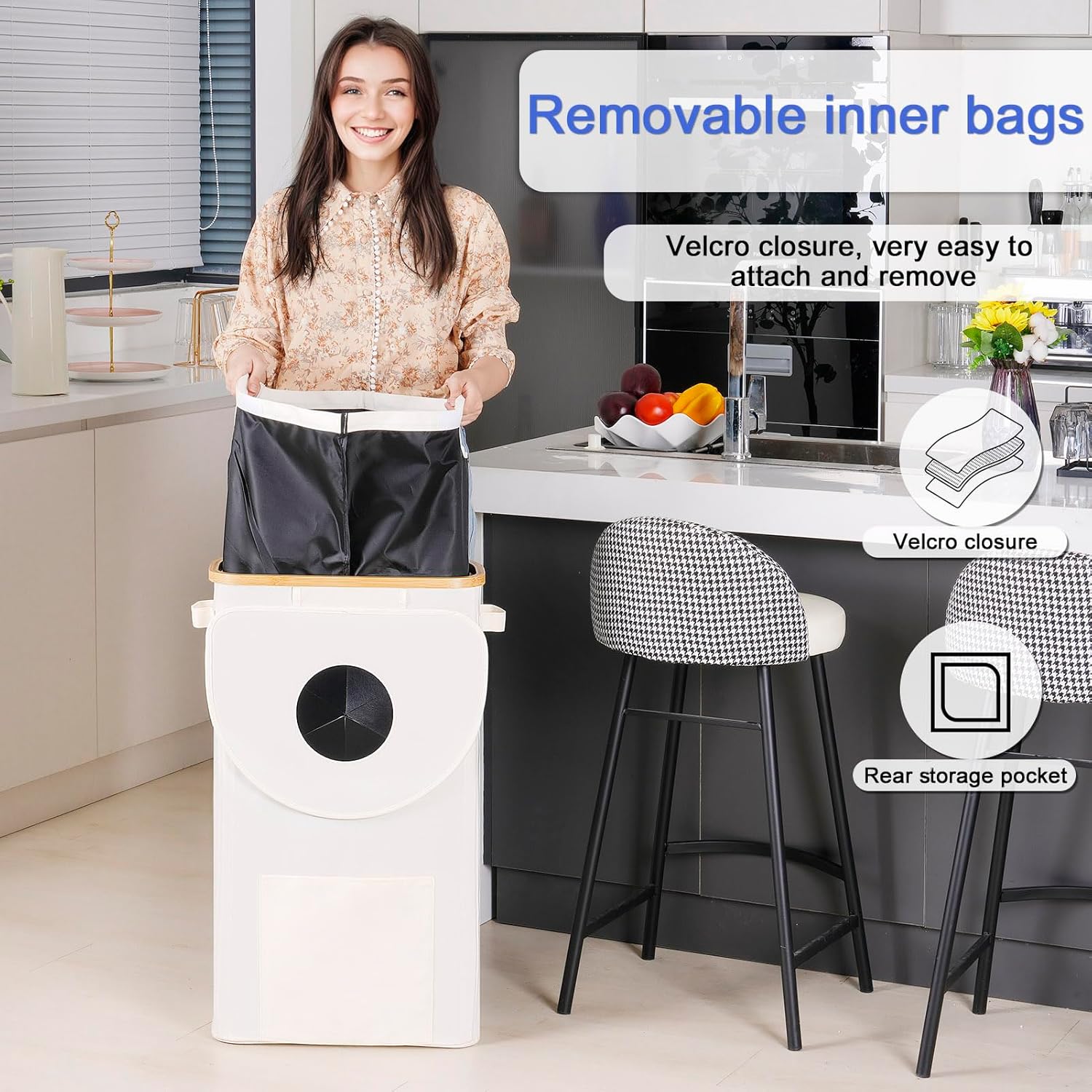 Efluky Recycling Bin 100L, 26 Gallon, Beige, D-Shaped, Oxford Fabric, 17.32"L x 12.9"W x 11.46"H, 2 Removable Inner Bags, Lightweight, Open-Top, Cycling, Kitchen