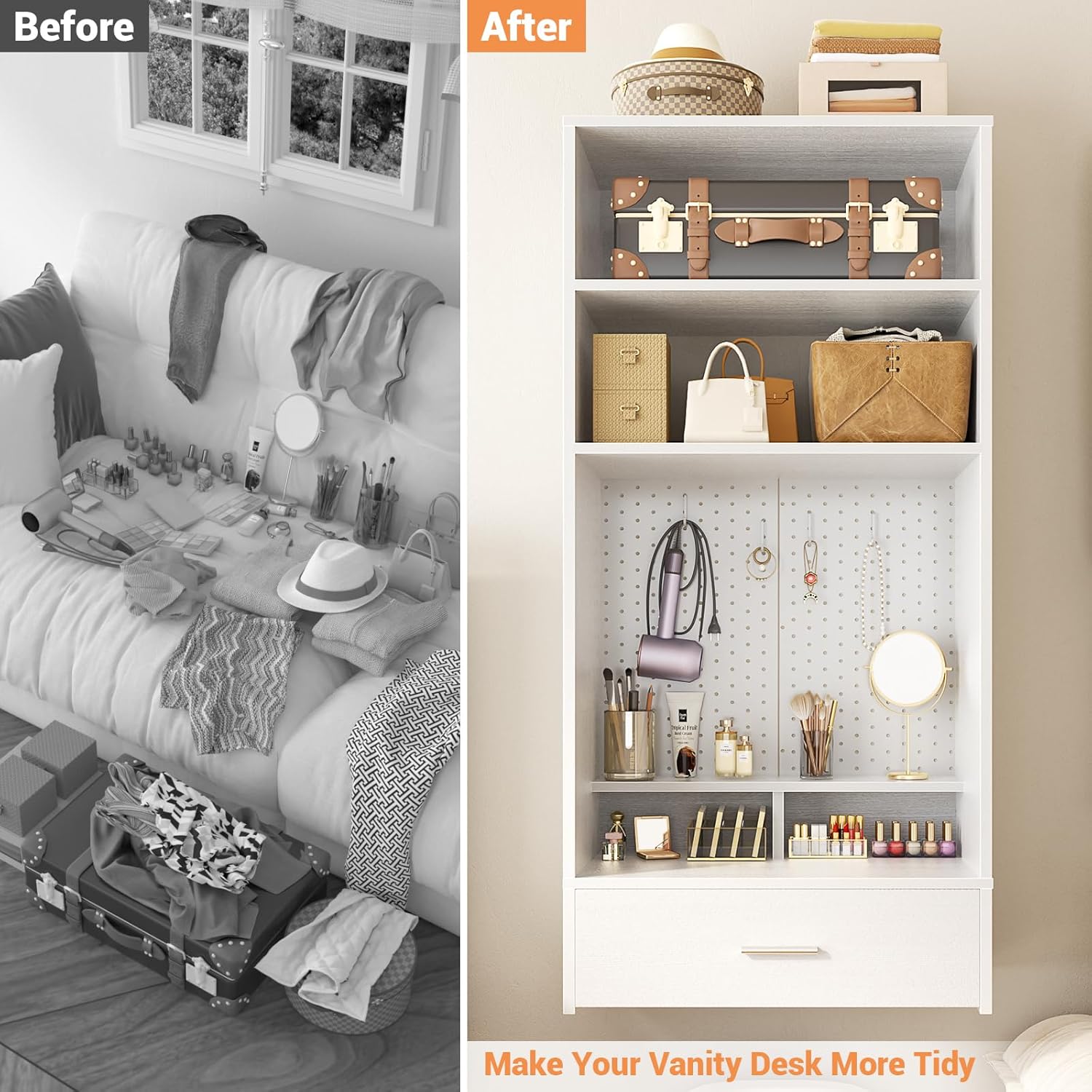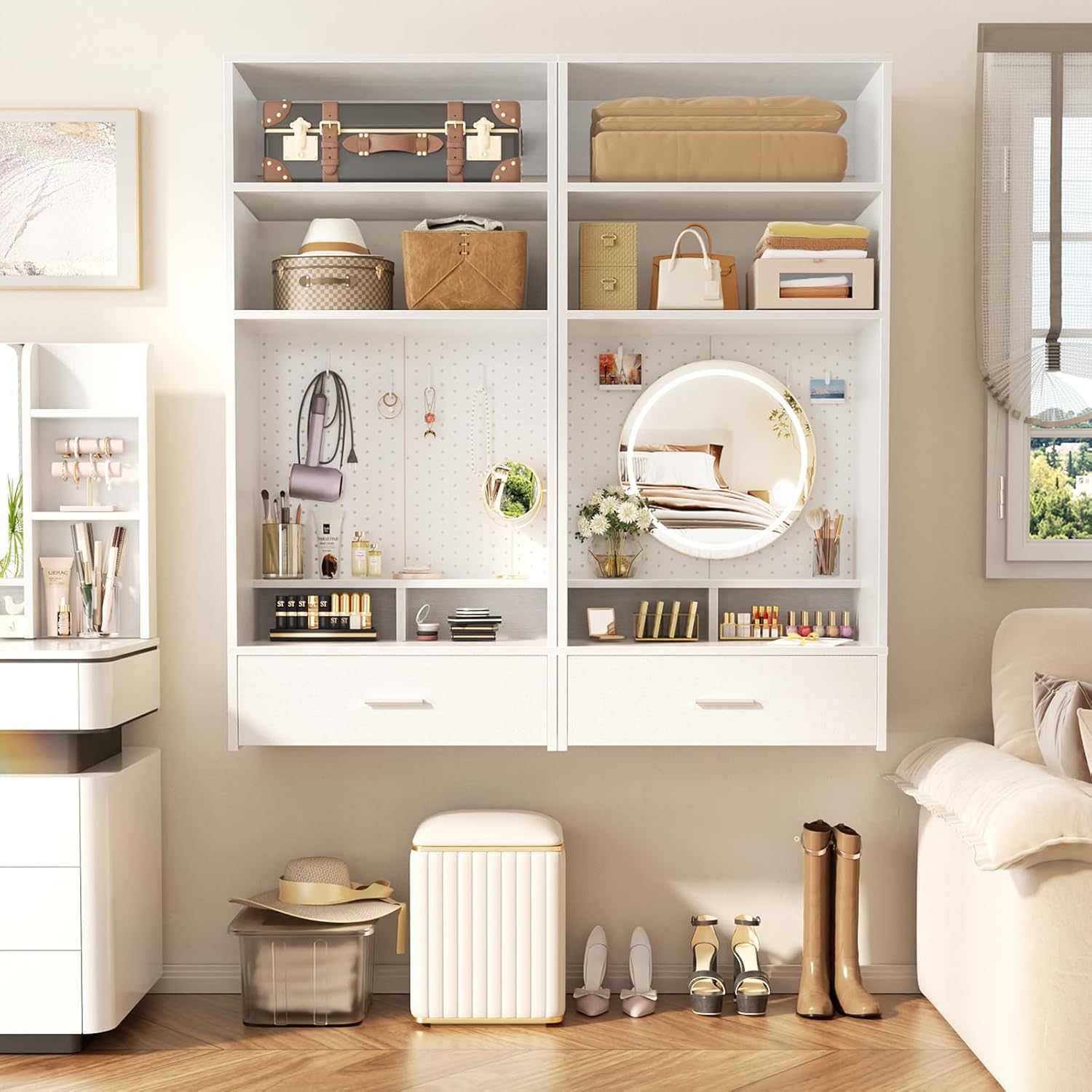Unikito 24 inch Closet System with Drawers and Magnetic Pegboard, Wall Mounted Closet Organizer with Vanity Storage Shelves, Multipurpose Vanity Desk for Bedroom, Mudroom, and Entryway, White