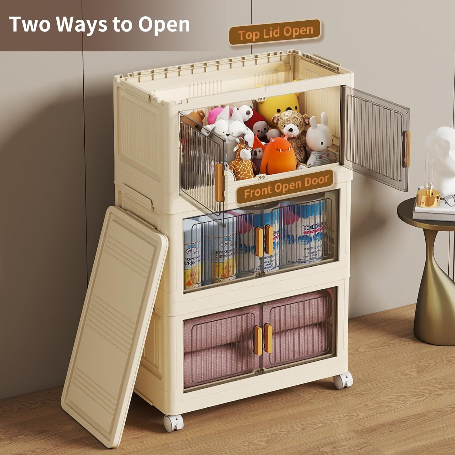 • Stackable & Removable Design: Foldable storage bins and a stackable storage box. Each level has matching grooves and clasps on the top sides to lock the storage bins securely, and the foldable design maximizes space in your home when not in use. There are 4 rotating wheels on the bottom for easy movement