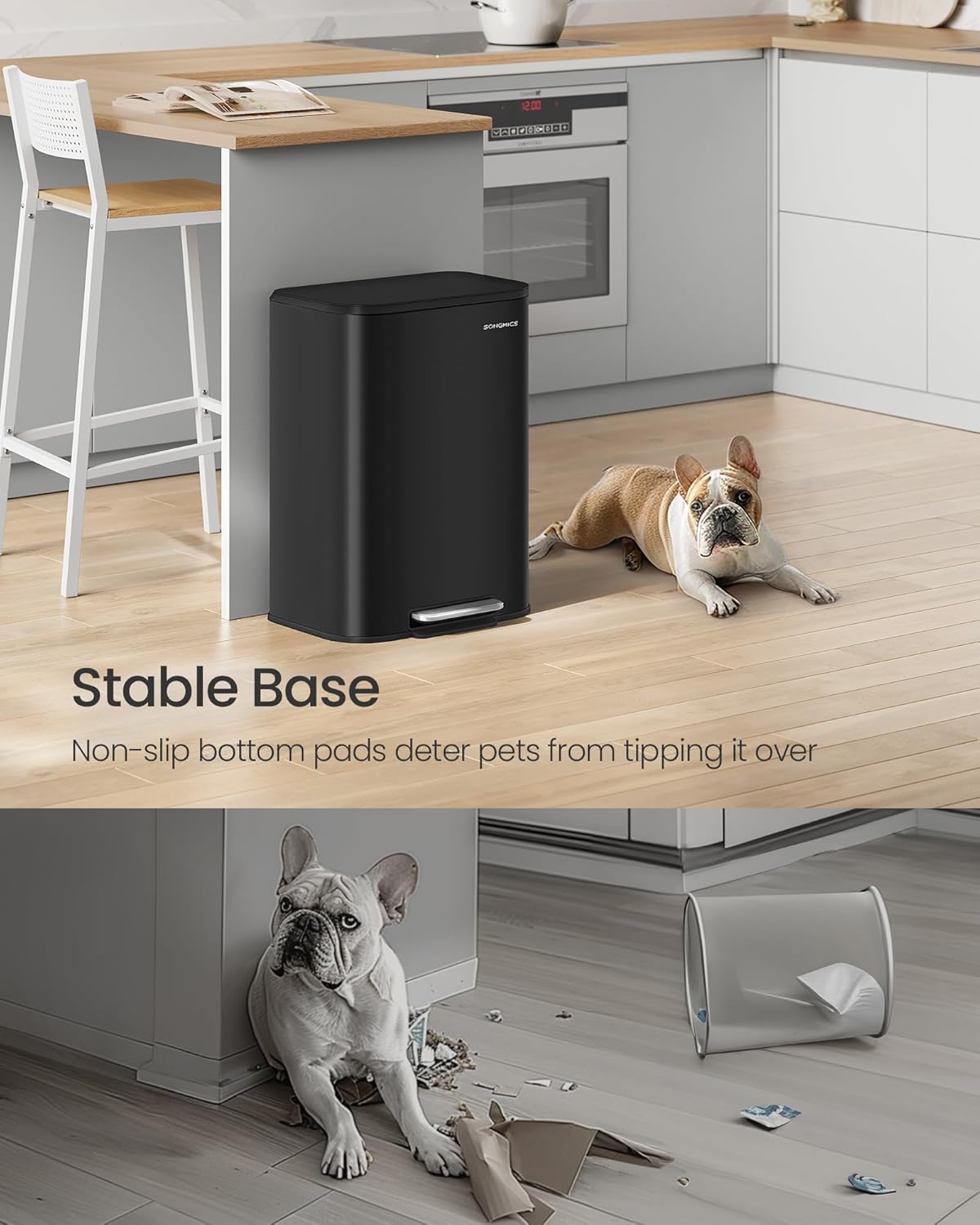 • [Durable and Stable] Made from robust stainless steel, this trash bin is resistant to rust, dirt, and is easy to clean. The base is equipped with non-slip pads to enhance stability, making it difficult for pets to tip it over