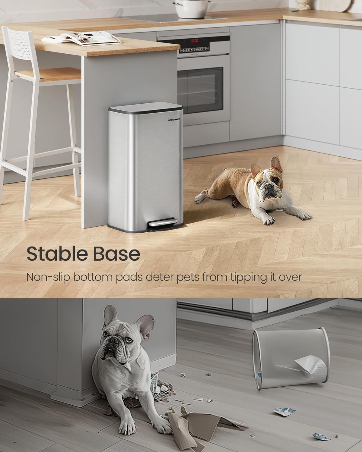 • [Durable and Stable] Made from robust stainless steel, this trash bin is resistant to rust, dirt, and is easy to clean. The base is equipped with non-slip pads to enhance stability, making it difficult for pets to tip it over