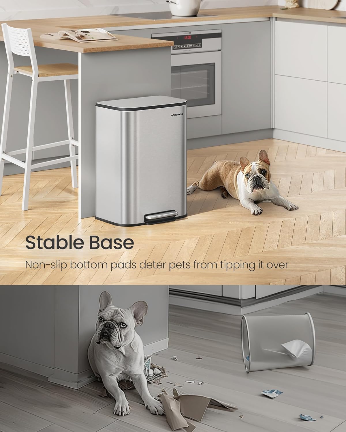• [Durable and Stable] Made from robust stainless steel, this trash bin is resistant to rust, dirt, and is easy to clean. The base is equipped with non-slip pads to enhance stability, making it difficult for pets to tip it over