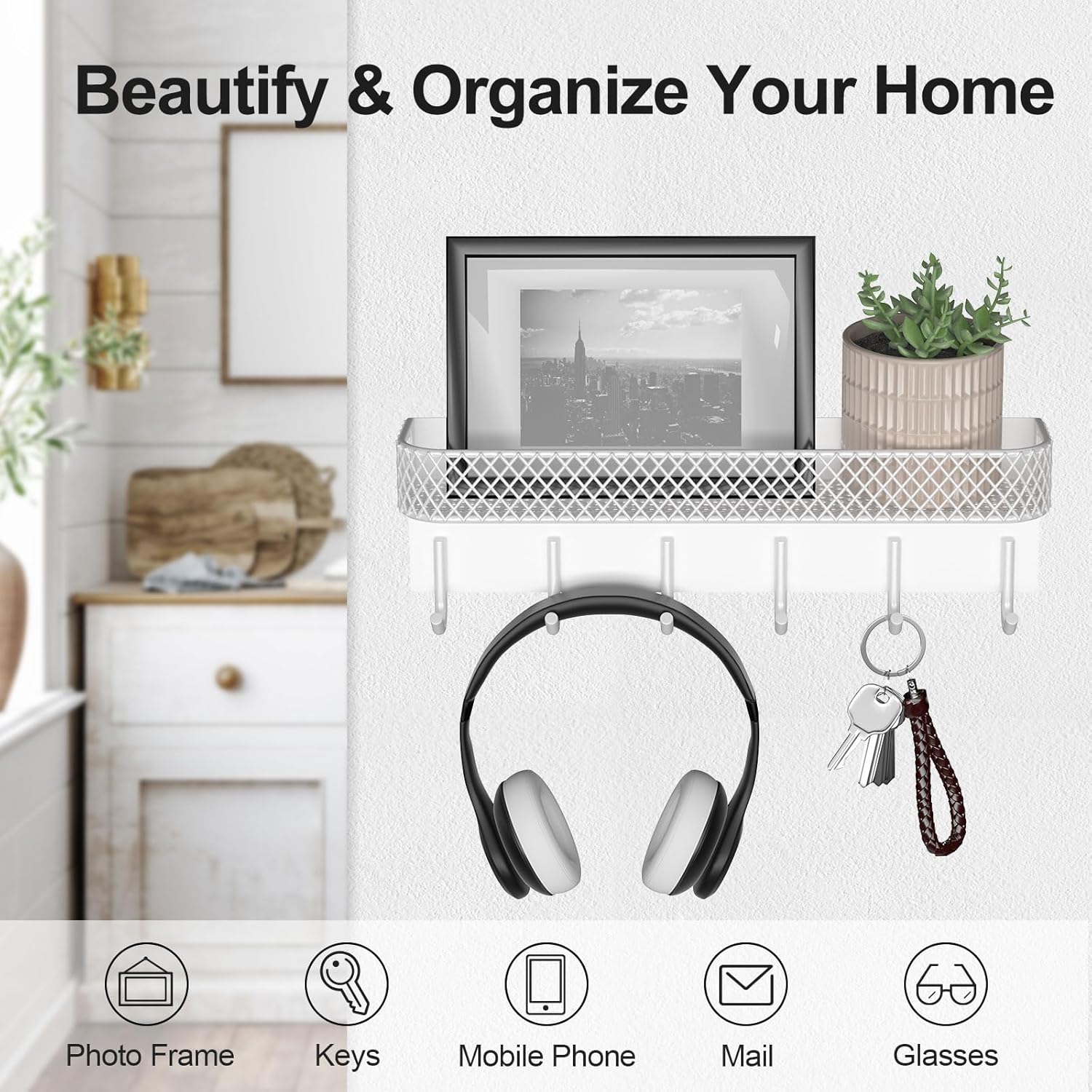 • MAIL HOLDER AND KEY RACK organizes any room instantly. Keep keyrings, sunglasses and other items organized and within reach of the front door, work desk, stove or shower with 6 sturdy key hooks.