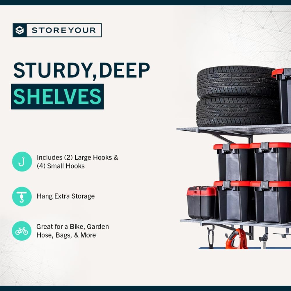 • INCLUDES STORAGE HOOKS – Comes with 2 large and 4 small garage hooks for added hanging storage under each wire shelf. Use the hooks for cords, garden tools, bags, or garage wall organizer systems. Maximize vertical space while keeping frequently used tools within reach.
