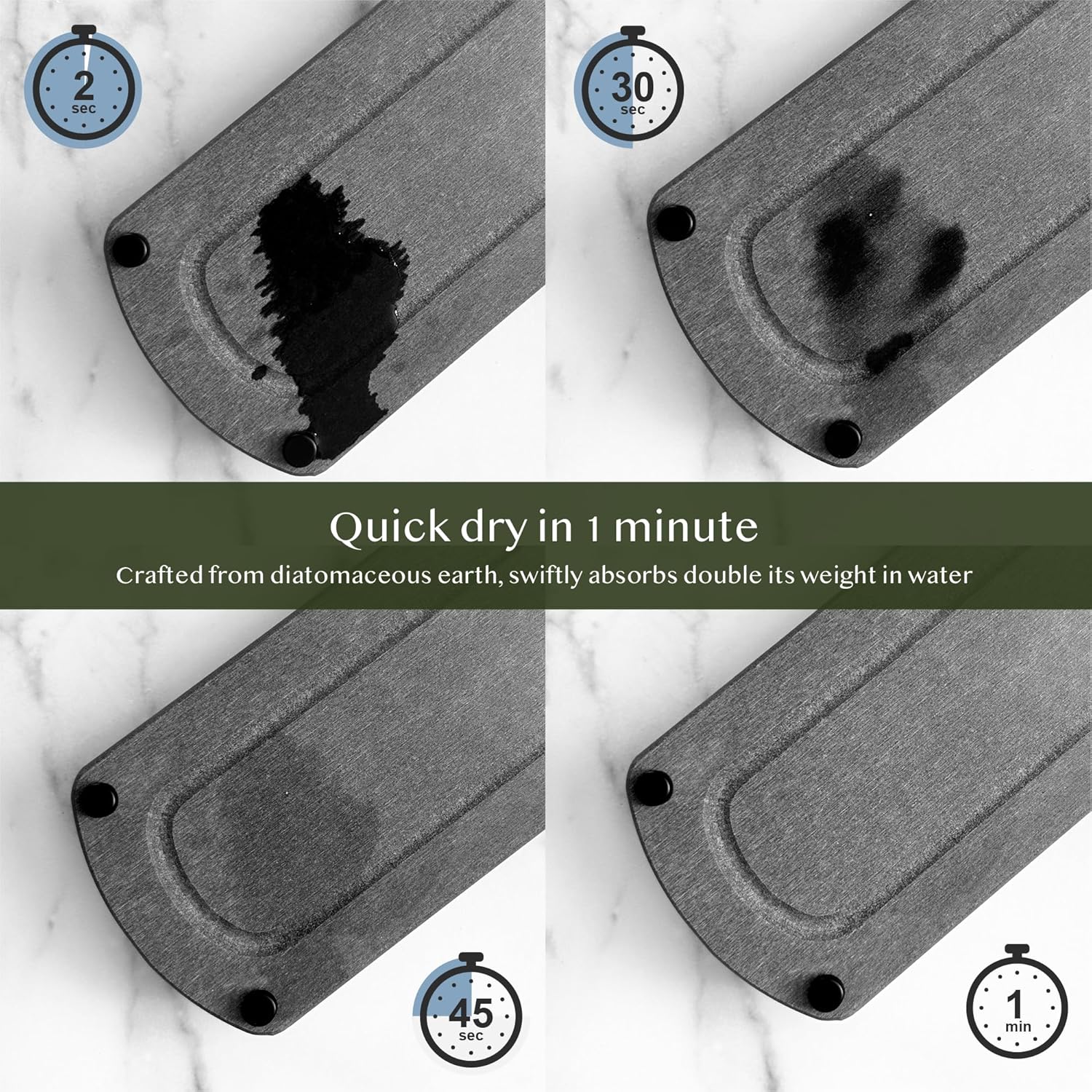 • Raised Stainless-Steel Feet with Air Ventilation – Sturdy 1.4-inch stainless steel legs lift the absorbent stone tray above the surface, improving airflow underneath and accelerating evaporation. This elevated non-slip design helps keep your countertop cleaner and extends the life of your drying rack compared with low-cost flat trays
