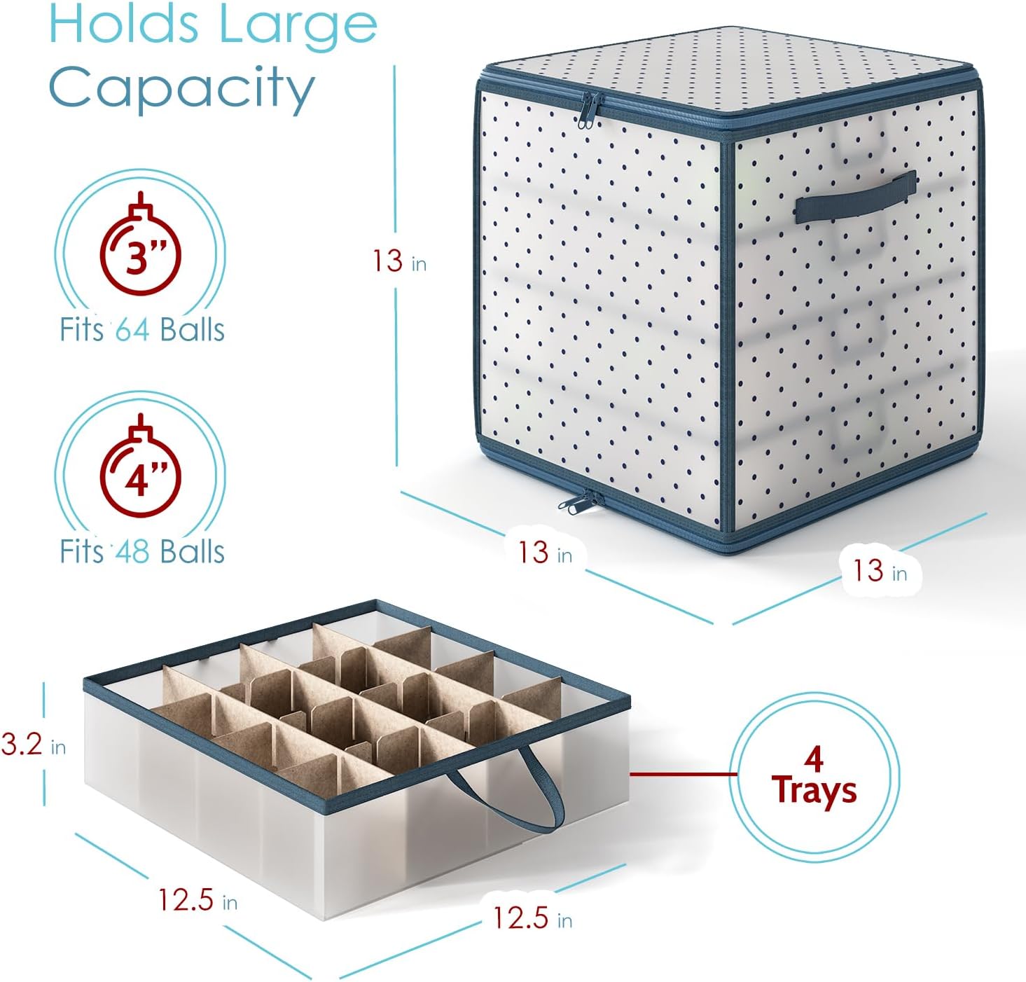 • Adjustable & Easy-To-Remove Dividers – Adjustable strong dividers make it easy to make space for any size ornament you need. Plus, exclusive finger slots on the dividers make them a breeze to remove without the hassle other Christmas storage boxes give you. They easily hold minimum 64 balls.