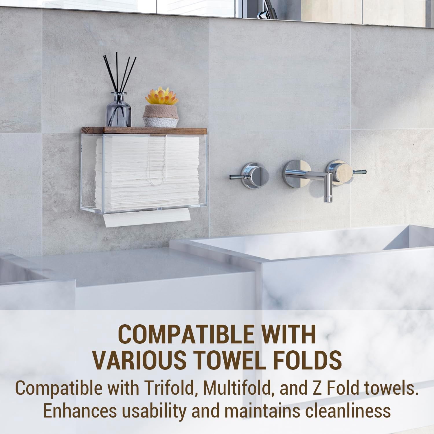 • Wall mounted folded paper towel holder and wooden display tray for commercial guest use in a bathroom, kitchen, office break room, and more