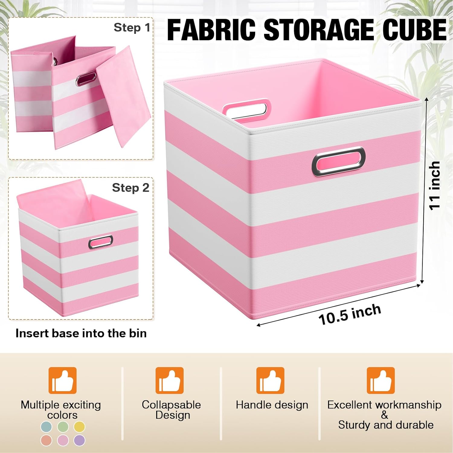 • Macaron color: elevate your organization with a touch of pastel perfection. Our set of 6 macaron-colored fabric storage cubes comes in an array of delightful hues: sky blue, light pink, yellow, pink, lavender purple, and emerald green. Each bin measures 10½"L x 10½"W x 11"H, perfectly sized to slot into your existing shelves or cabinets, adding a splash of color while keeping your space tidy