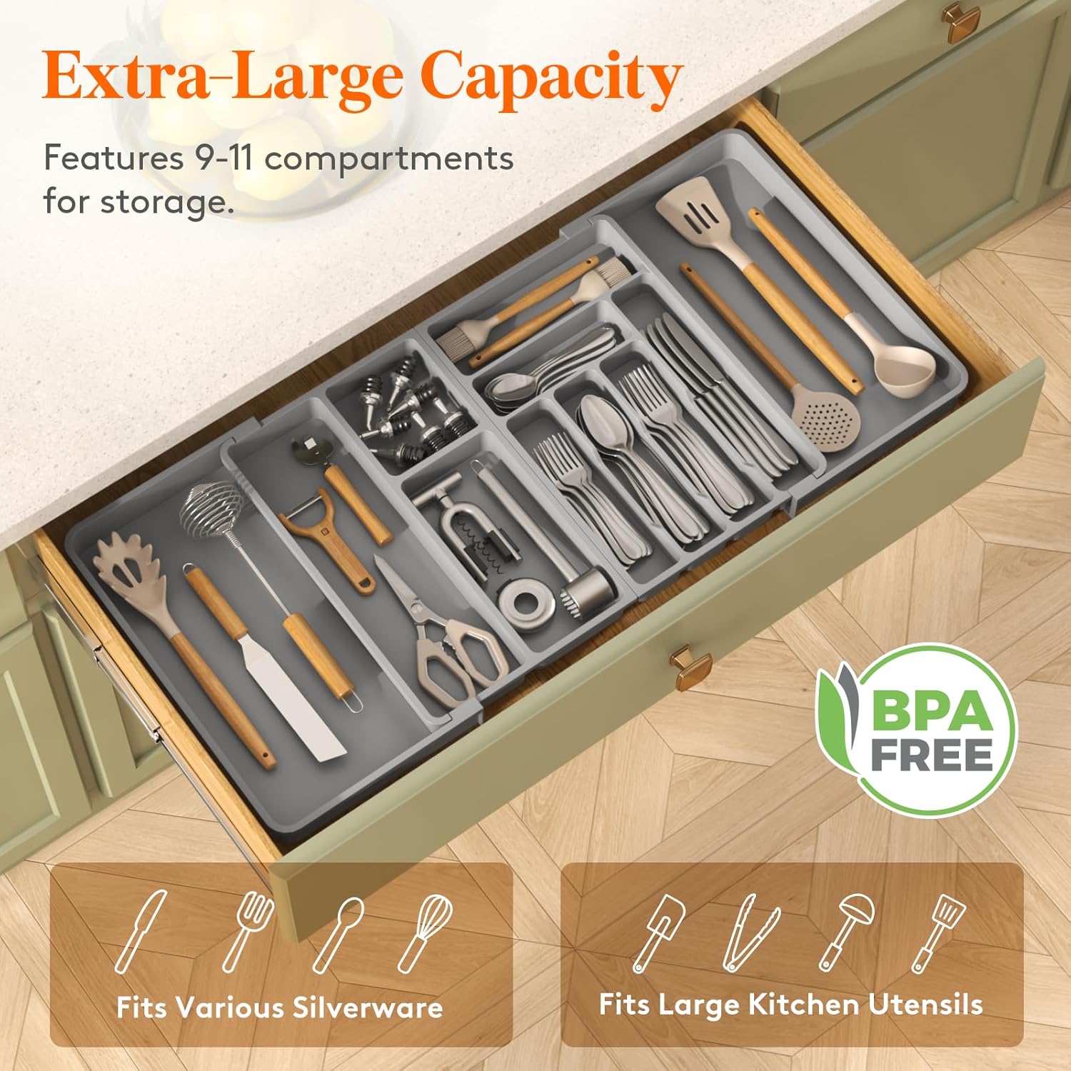 • Sort Your Silverware: The silverware tray comes with 9-11 compartments, creating more space in drawers for spatulas, ladles, tongs, utensil sets, and whisks. Streamline your cooking with a no-install organizer that keeps cutlery at your fingertips
