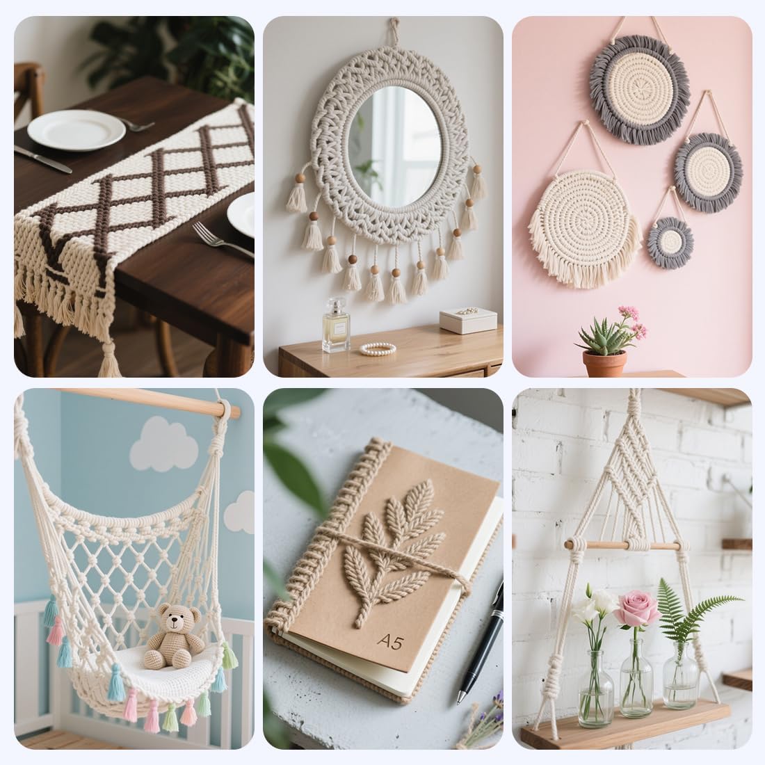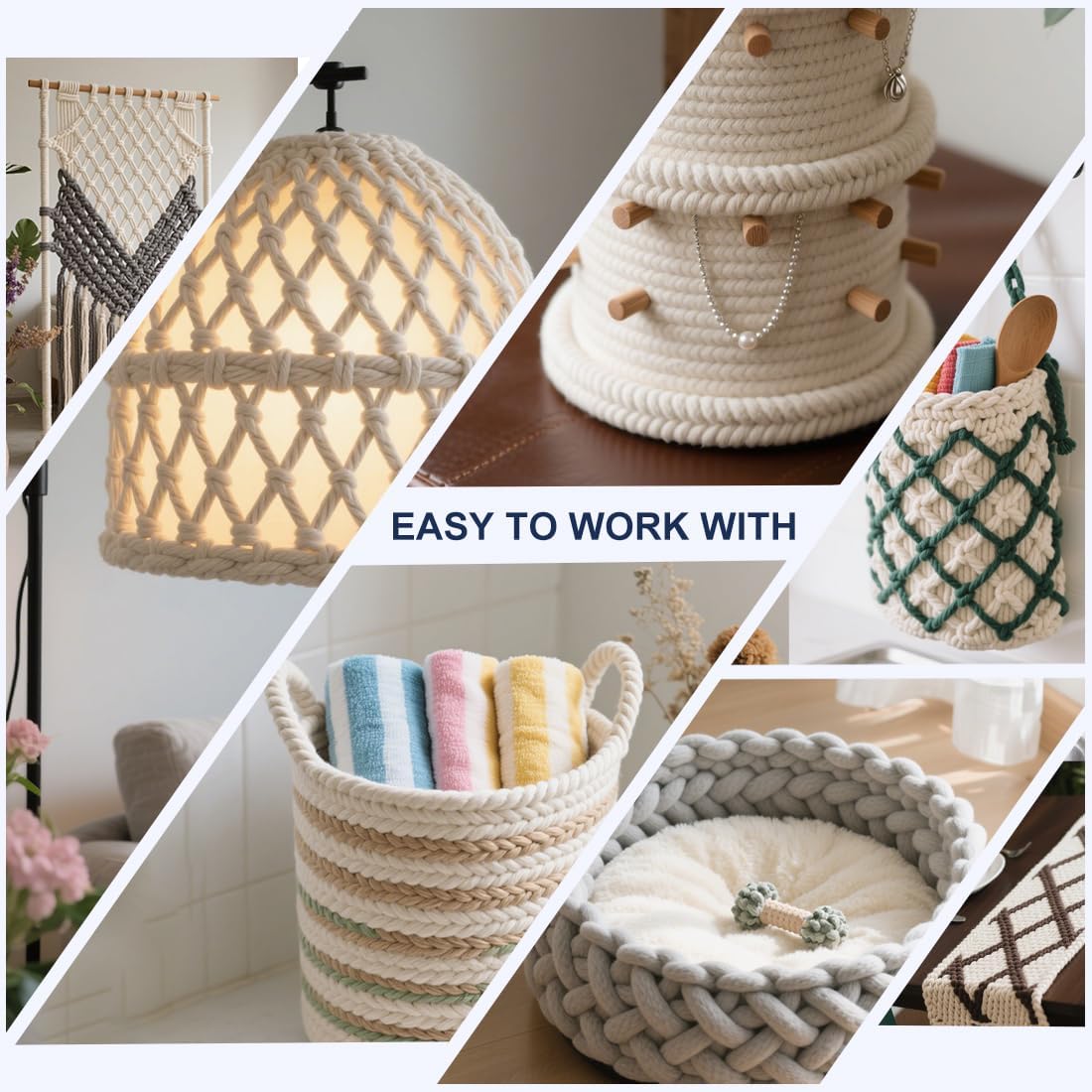 • 【GREAT FOR CRAFTING】The high quality of the materials used and the sturdy braided design make our craft rope very strong and durable, yet still soft somehow to the touch. And these thin ropes can be easily knotted. Great for making a variety of handmade products such as rope bowls, coasters, placemats, purses, baskets, cat scratching posts and so on.