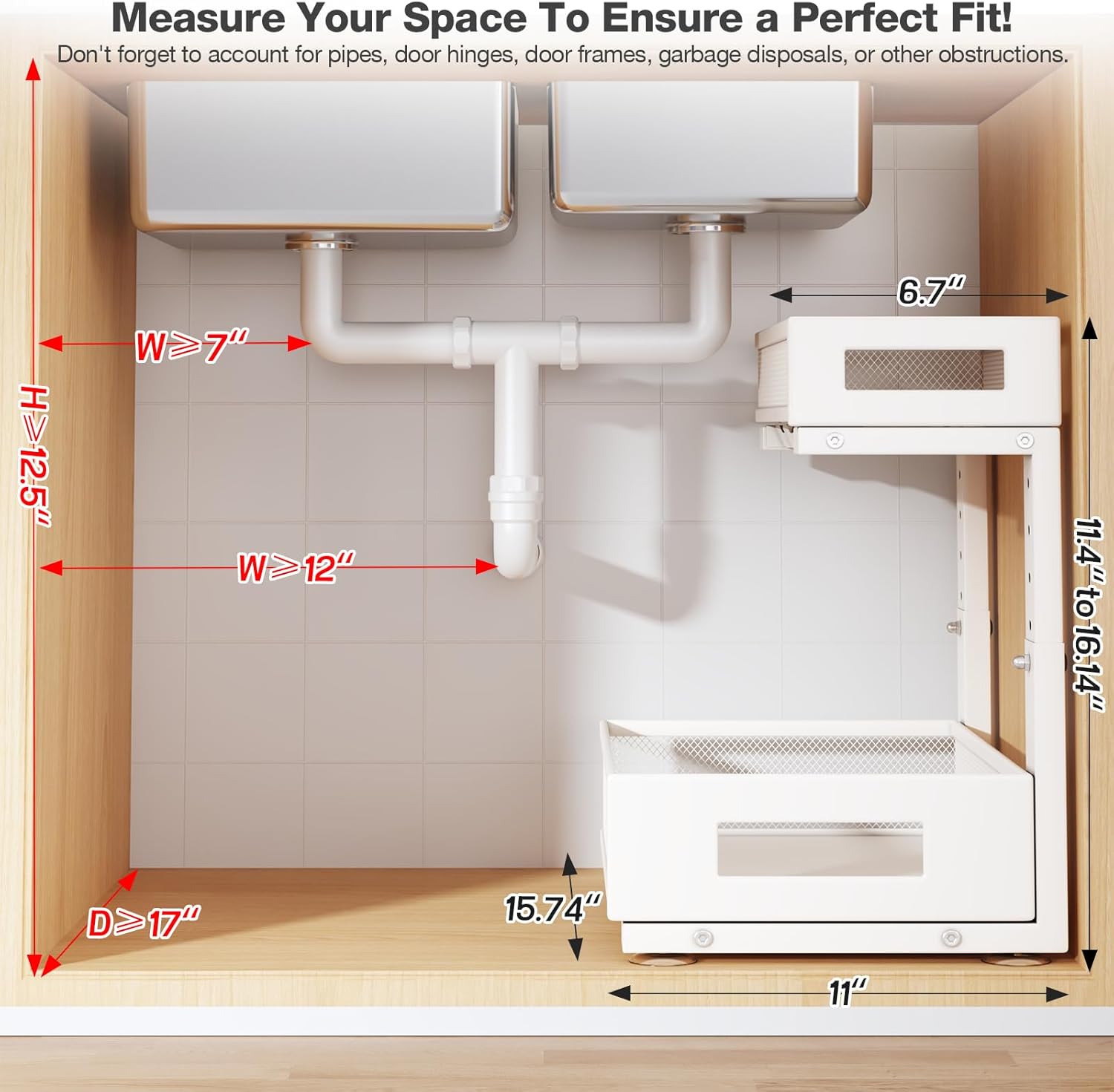 2-Pack Under Sink Storage Organizer, Large 2-Tier Elegant Mesh Pull Out Shelf for Kitchen and Bathroom Cabinet Organization, L-Shaped and Adjustable Height Design for Maximum Space Efficiency-White