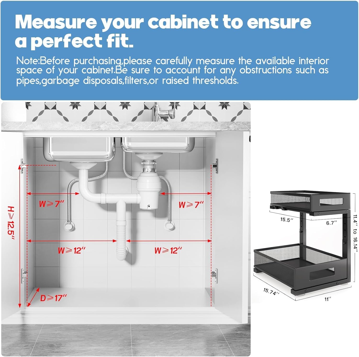 • 【2-Tier Pull-Out Design for Easy Access】This under-sink organizer features a double-layer pull-out design, allowing you to easily access items at the deepest part. The upgraded, thickened iron circular sliding rails ensure a smooth and seamless pulling experience, making each use effortless. The unique pull-out locking mechanism effectively prevents the drawers from being completely pulled out, avoiding the risk of items falling or structural damage caused by over-pulling, ensuring safer and more convenient use.