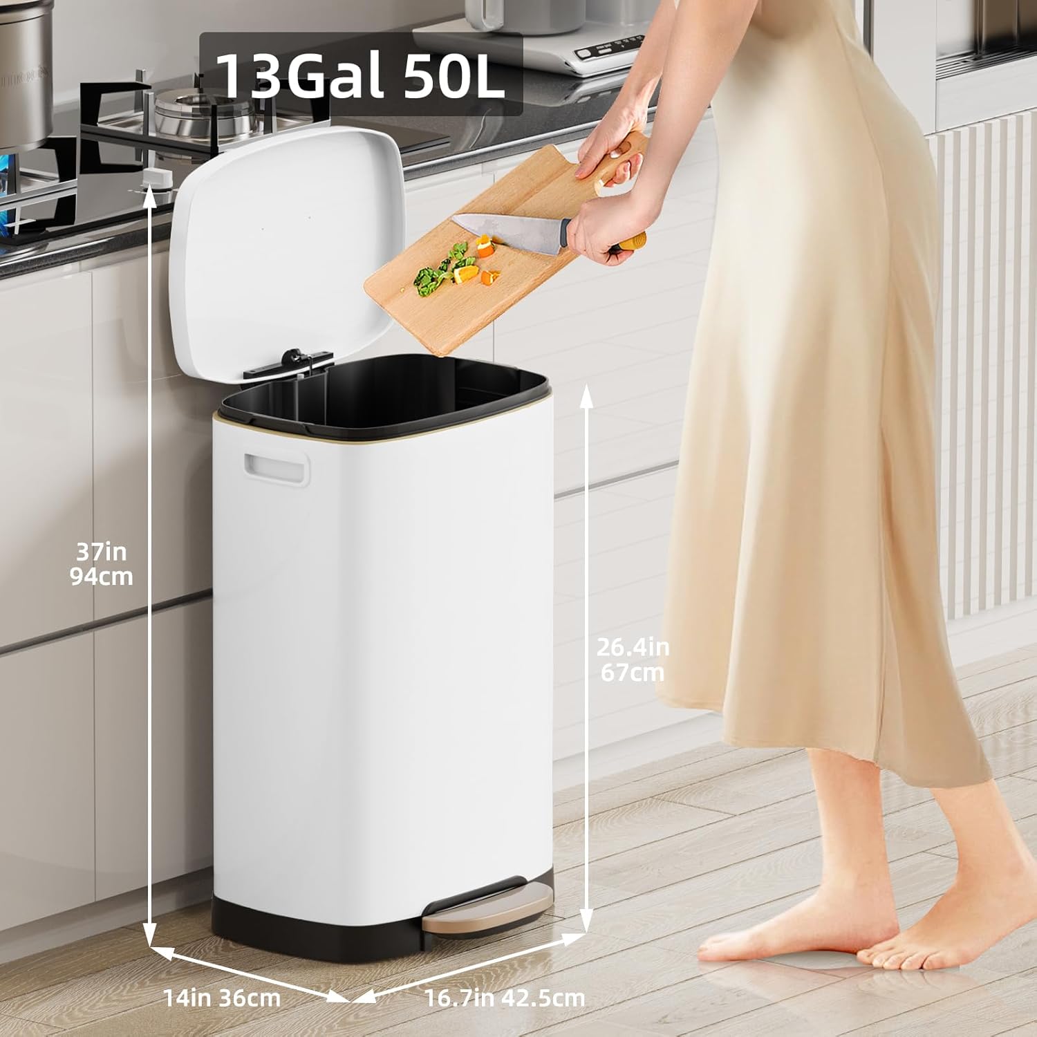 • 🚮 Large Capacity & Odor Lock Technology: 50L (13 Gallon) extra-large capacity reduces frequent trash runs, perfect for busy kitchens. Sealed lid with odor-blocking design traps smells, keeping your space fresh and clean.
