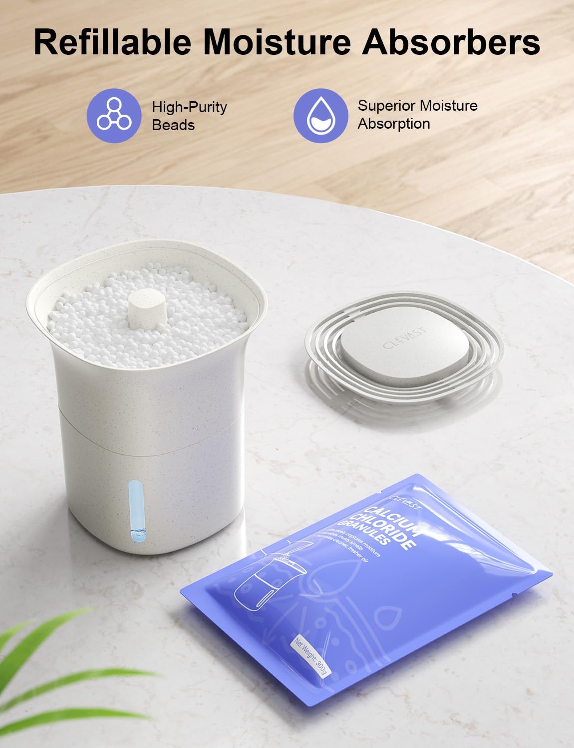 • REFILLABLE MOISTURE ABSORBERS: The moisture-absorbing cup, crafted from durable ABS and wheat straw, is reusable and sturdy. Once the dehumidifying pellets are depleted, it can be refilled with CLEVAST calcium chloride granules(ASIN: B0DWFBV35B).