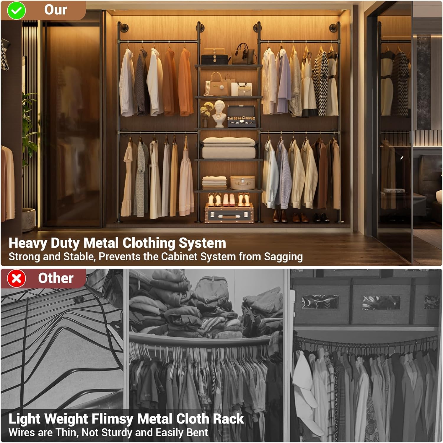 • 【Strong Bearing Capacity】This multifunctional Walk-in Closet System consists of vintage industrial pipe clothes rack that contains 4 detachable heavy duty metal hanging rods and 5 storage shelves, modular devise for flexible configuration, load capacity up to 800lbs, not easily deformed and wobble. Dimensions: 77" L x 13.8" W x 86.5"H.