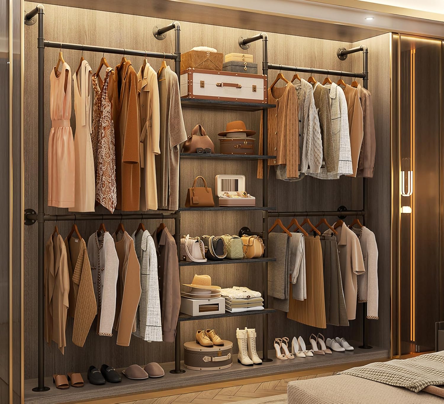 • 【Multifunctional Closet System】This versatile wardrobe rack features a spacious hanging rod for clothes, and multiple shelves for folded garments, shoes, and accessories, Whether used in the bedroom, walk-in dressing, closet wardrobe, or entryways, this garment rack helps maximize space while keeping your belongings neat and accessible.