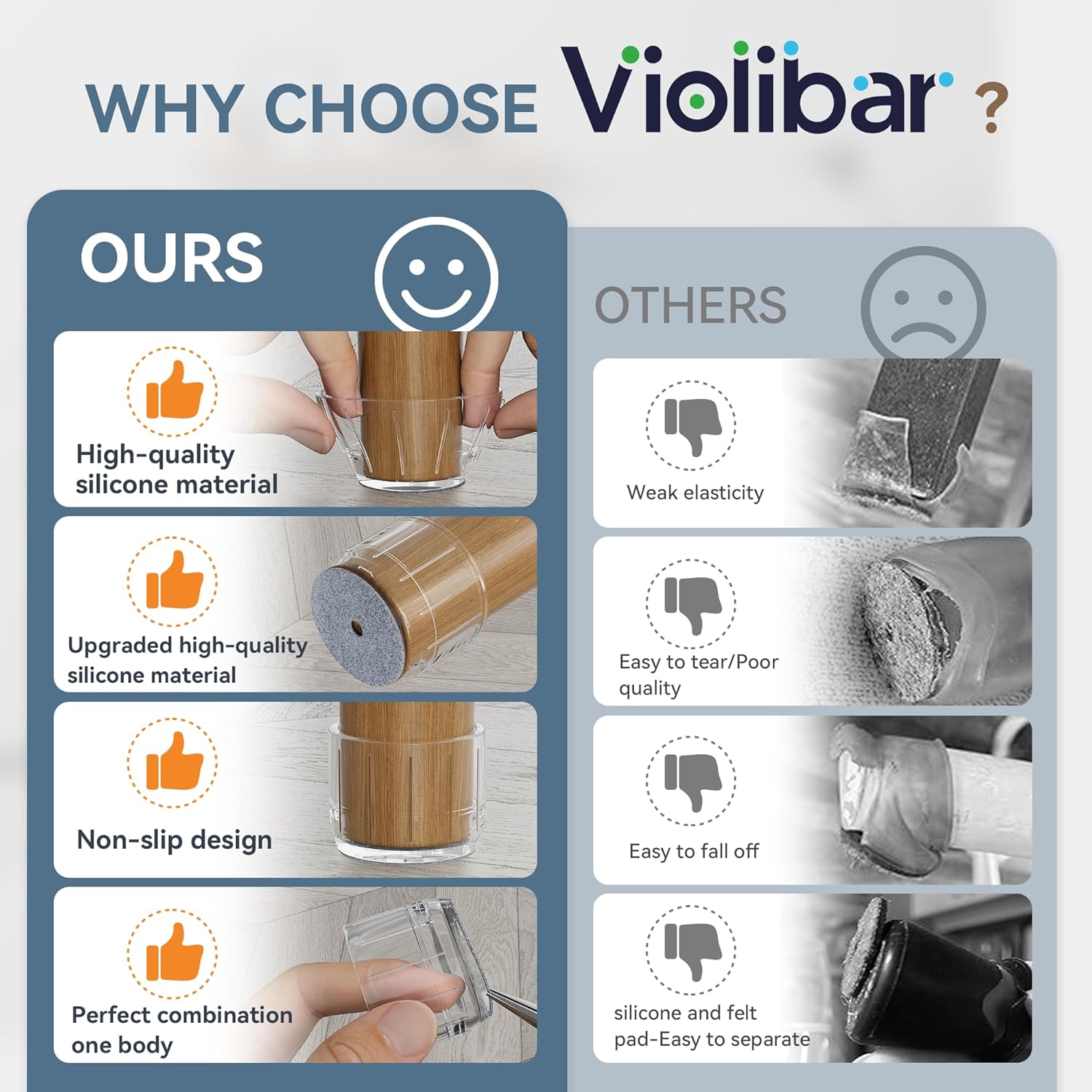 • ✅【Comprehensive Improvement】The chair leg floor protectors use special technology to combine the felt and silicone into one inseparable piece, which prevent the felt pad from falling off during use. We chose the premium quality silicone material which bonds the felt pad better, and won't tear easily when stretched.