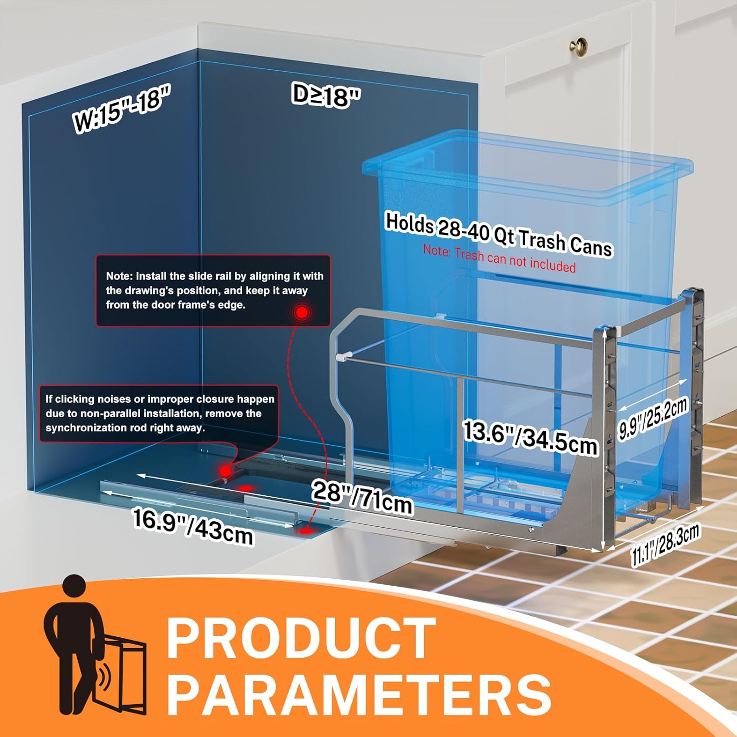• Premiun Material: Trash can pull out for kitchen cabinet is made of high-quality carbon steel with a powder-coated surface, ensuring durability and rust resistance. It can be easily cleaned with a cloth. The frame has a load capacity of 100 pounds, which is 50 pounds more than regular slides.