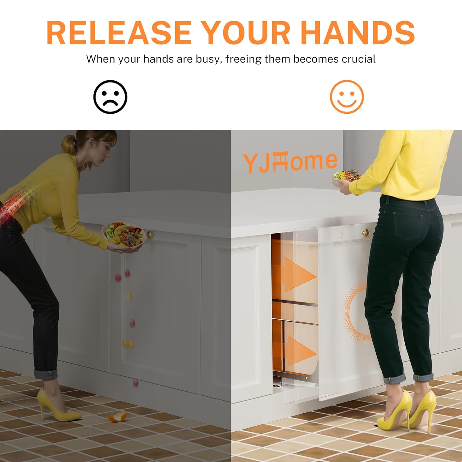 • Space Saving Pull Out Trash Can: YJHome pull out trash can under cabinet conceals your kitchen bin beneath cabinets or the sink, saving valuable space. Note: Without Garbage Can, Without Cabinet. The screws provided for attaching to the cabinet door are 12mm in length. Please measure the thickness of your cabinet door first to ensure the screws do not penetrate through!