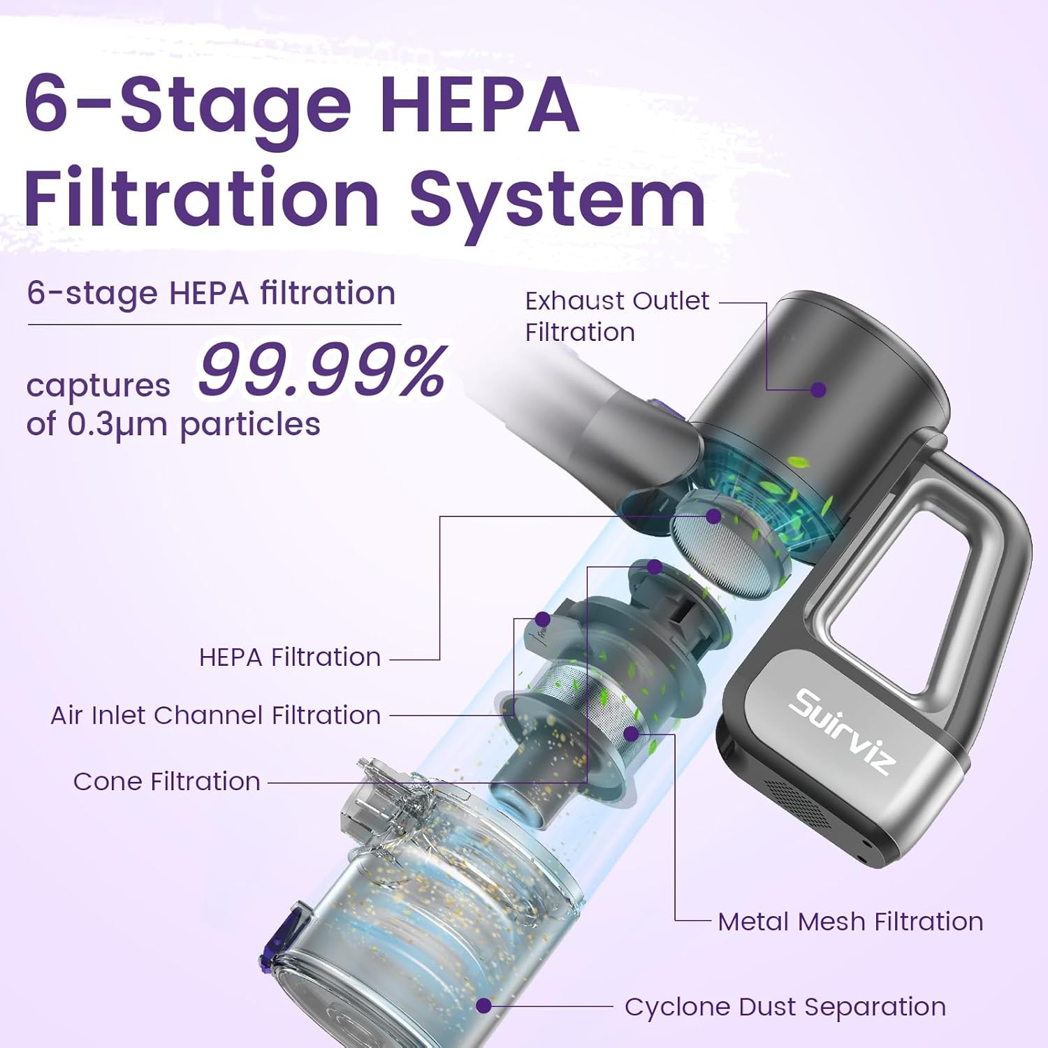 • ♻️HEPA Filtration – Breathe Easy with Clean Air♻️ The cordless vacuum for home features an advanced HEPA filtration system that captures 99.97% of particles. Enjoy cleaner, fresher air with every clean, making it an ideal choice for homes with pets. Breathe easy knowing your vacuum is working hard to improve indoor air quality.