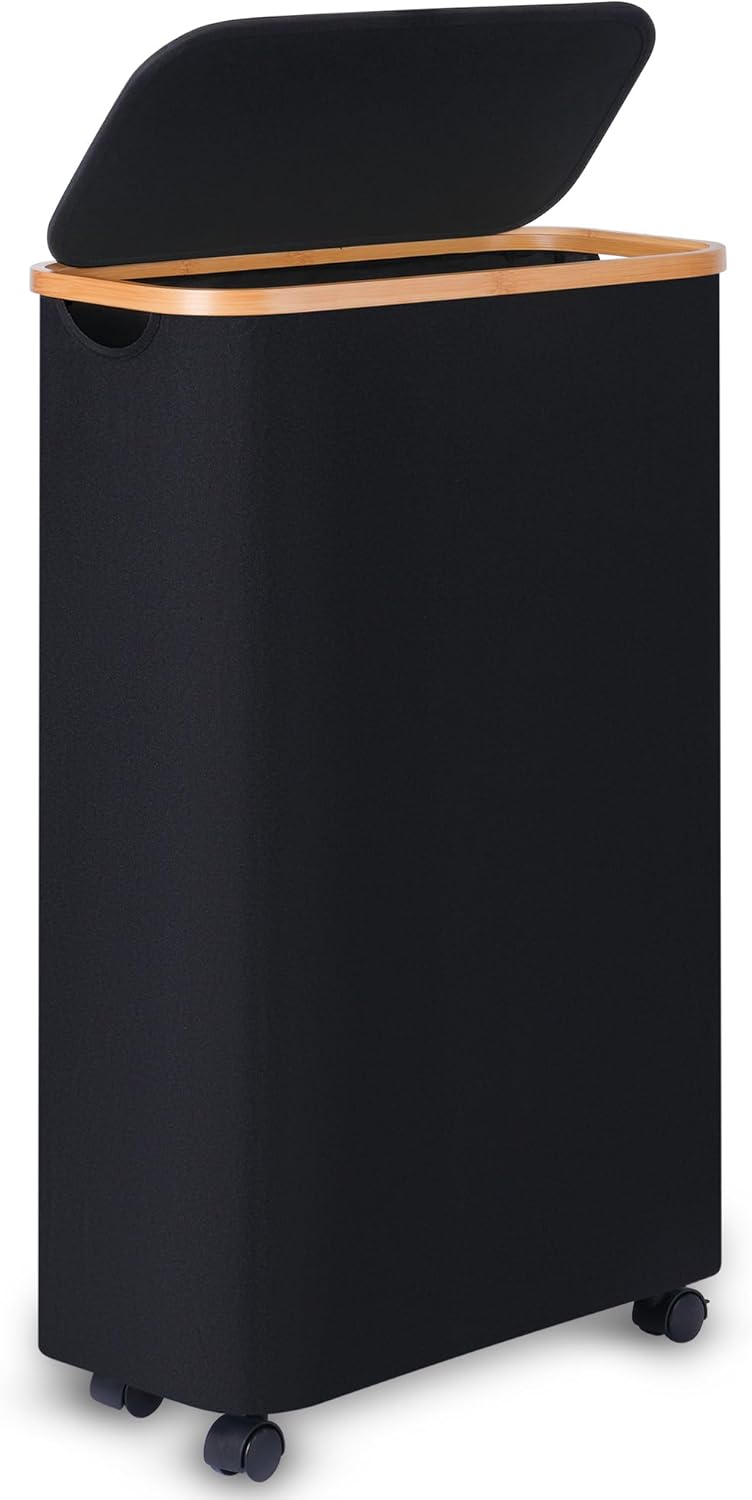 Slim Laundry Hamper with Wheels,Narrow Hampers for Laundry,Freestanding Laundry Basket with Lid&Bamboo Handles,Collapsible & Waterproof Tall Cloth Hamper for Dorm Family(60L,Black)