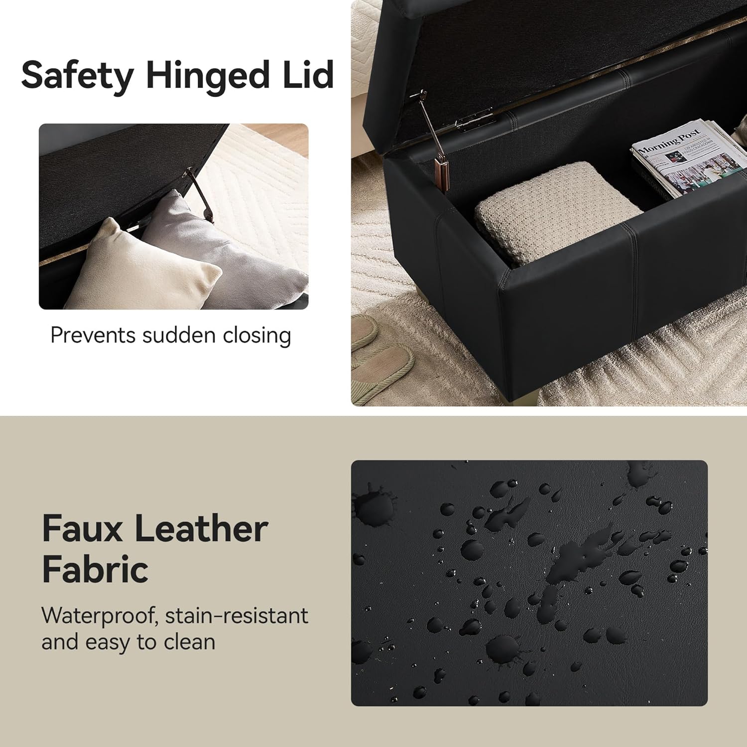 • PREMIUM MATERIALS: Our storage ottoman crafted with premium faux leather and sturdy wooden leg, high elasticity sponge filling the seat cushion, which is waterproof and wear-resistant, this ottoman ensures stability, comfort, and long-lasting quality.