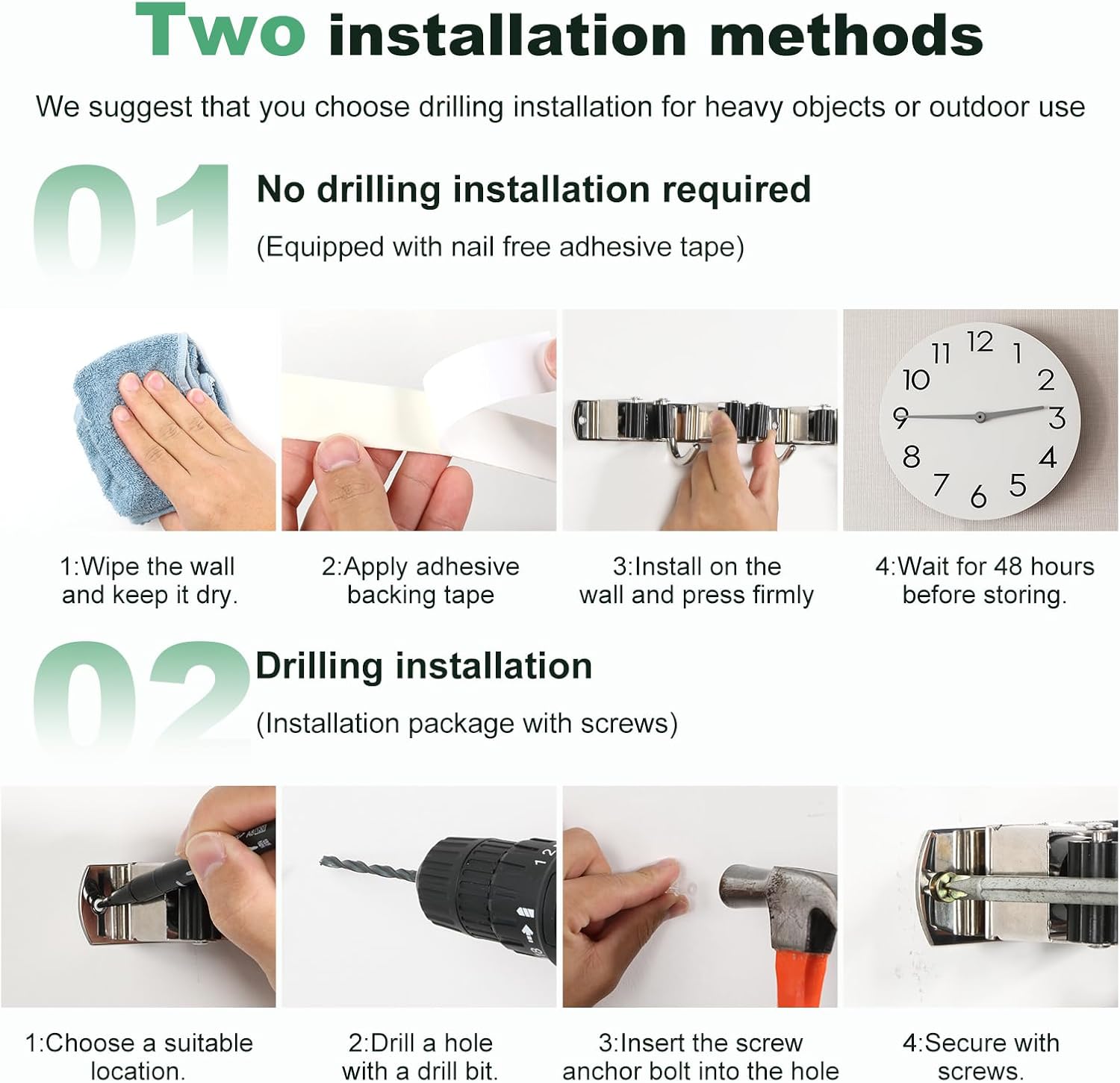 • Premium Material: The broom mop organizer is made of stainless steel, rust proof; scratch resistant and waterproof. It can hold up to 30lbs when mounted with screw holes, and about 8lbs when mounted with self adhesive backing sticker