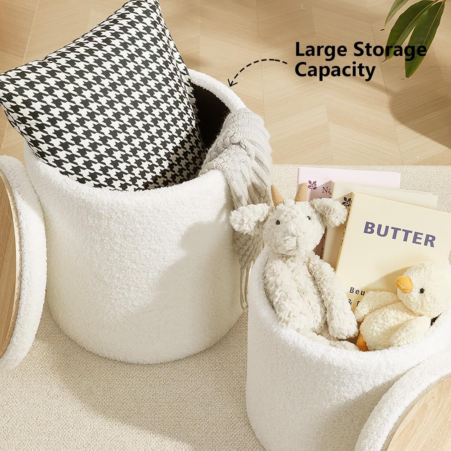 Boucle Round Ottoman with Storage Set of 2,Small Foot Stool Ottoman for Living Room, Small Coffee Table,Vanity Stool with Storage for Bedroom, White