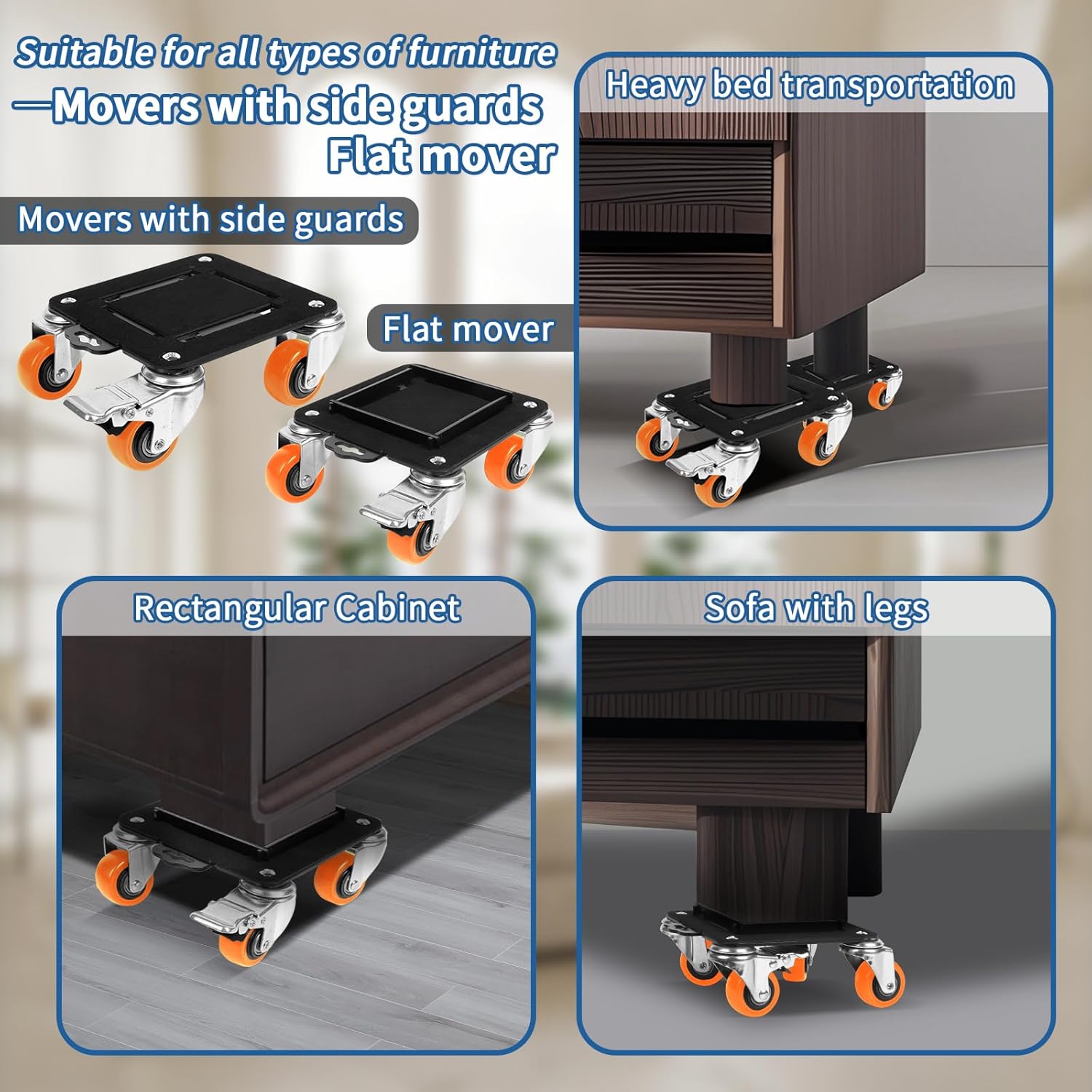• Furniture Movers with Wheels for Smooth Transport : Four smooth-rolling wheels make it easy to move furniture in any direction without scratching hardwood, tile, or carpet.
