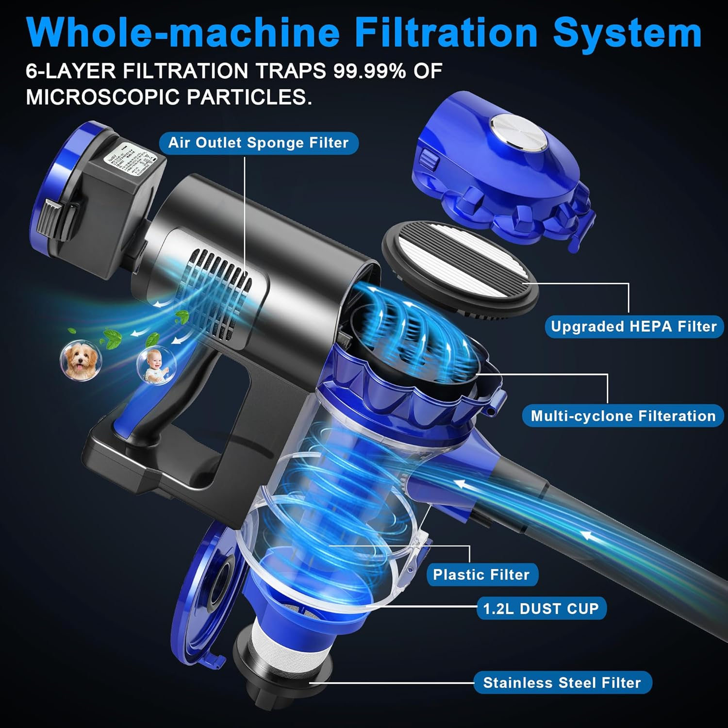 • Efficient Multi-cyclone Filtration System: With a 6-stage sealed cyclone filtration system, the D300 bagless vacuum captures 99.99% of fine particles down to 0.1um. The 9-cone cyclone design prevents fine dust from clogging the HEPA filter and prevents the motor from overheating. This feature ensures you spend less time on maintenance and enjoy clean air when cleaning your home.
