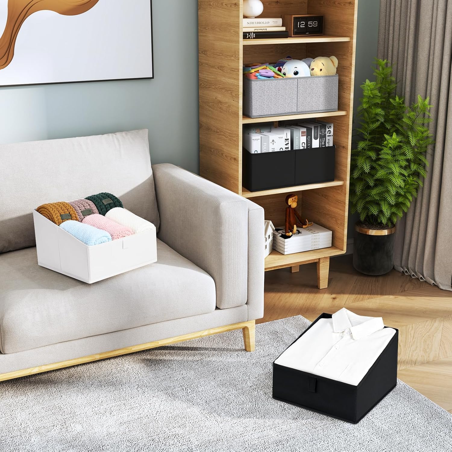 • 【Trapezoidal Design】These storage cubes are Trapezoid design that makes finding things convenient, also allows easy access when putting on the highest shelf. These are ideal closet bins for clothes, bags, shoes, towels, blankets, toys, dolls, and more
