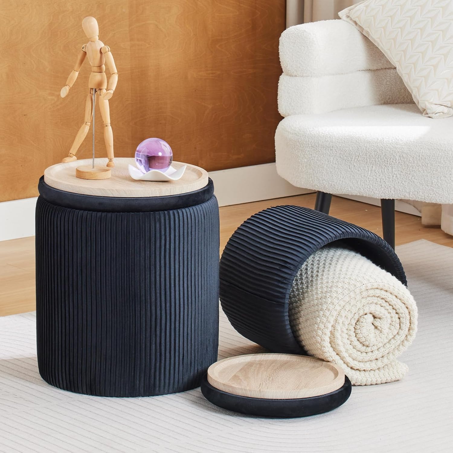 Round Ottoman with Storage Set of 2-Upholstered Velvet Vanity Stool for Makeup Multifunctional Ottomans Coffee Table Padded Seat Foot Rest for Living Room&Bedroom (Black-Upgrade Tray Lid)