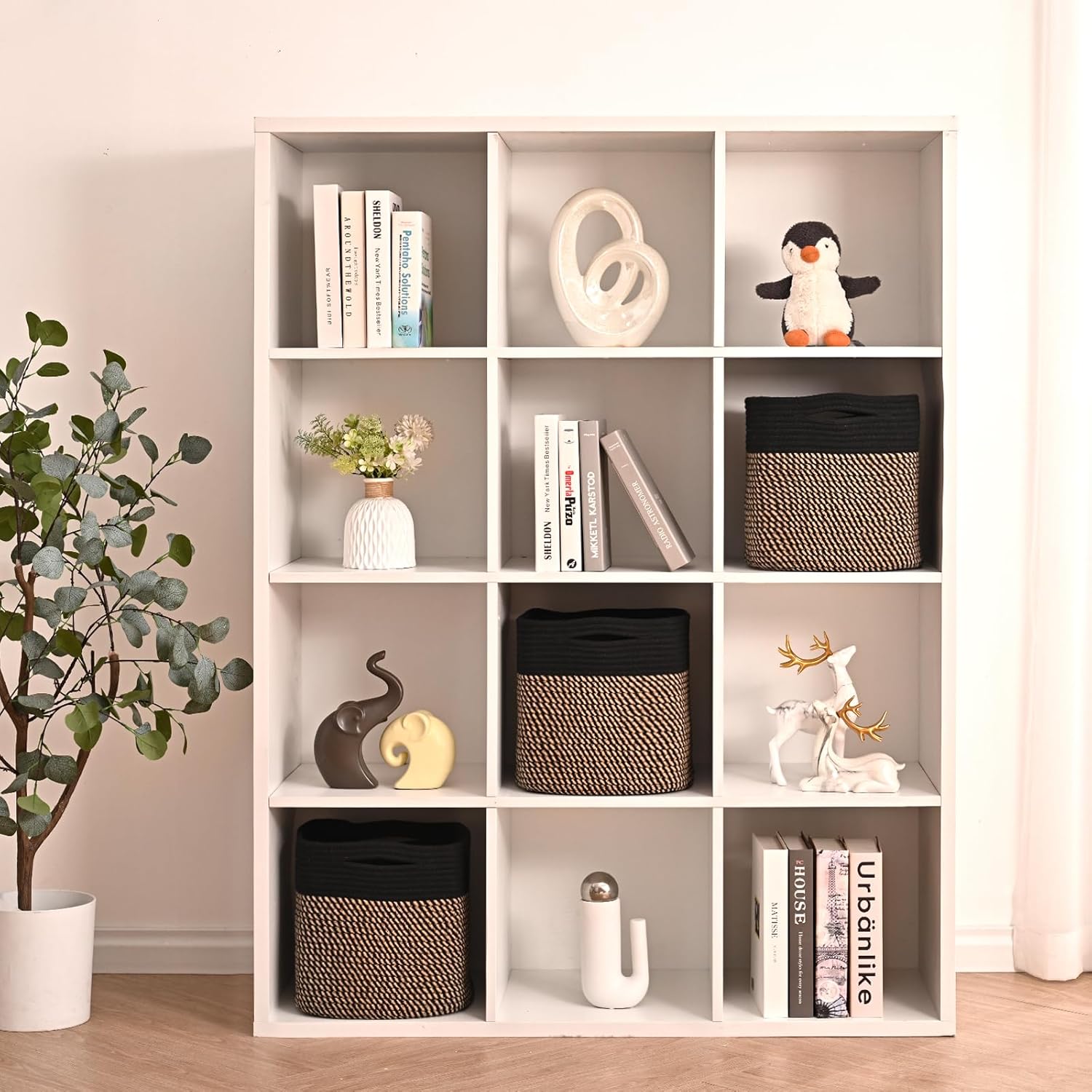 11 Inch Cube Storage Bins, Storage Cube Organizer Bins, Woven Cotton Rope Baskets for Storage, Storage Basket for Organizing Shelves, Square Baskets for Toys Nursery, Black & Jute (Pack of 3)