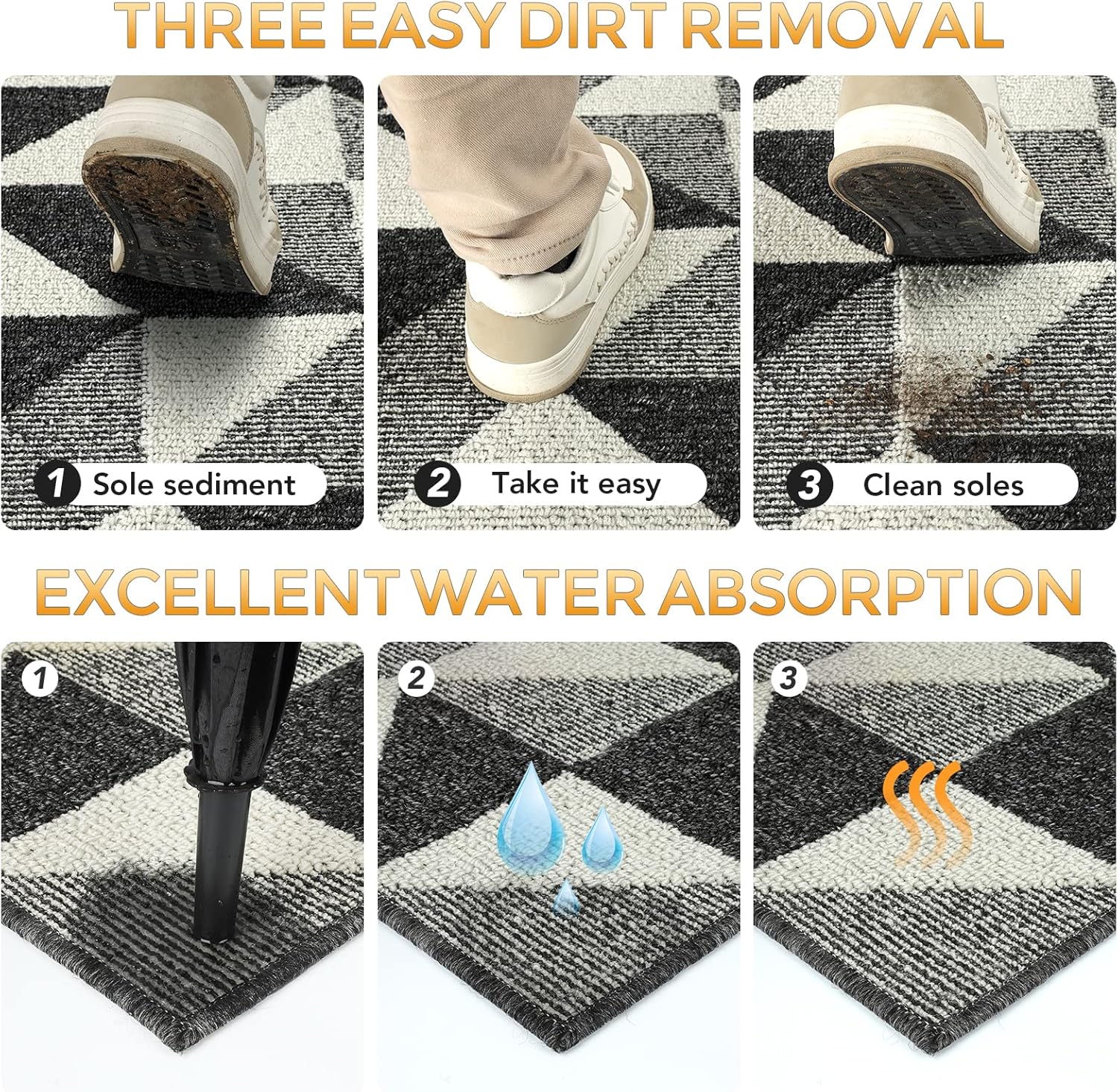 • Durable & NON-SLIP: Our Indoor Doormat is made of high-quality absorbent polypropylene fabric, uses double layer technology which absorb moisture and dirt from shoes quickly, makes your floors clean and dry. And the non-skid TPR rubber backing won't scuff floors, perfect for both indoor and outdoor use.