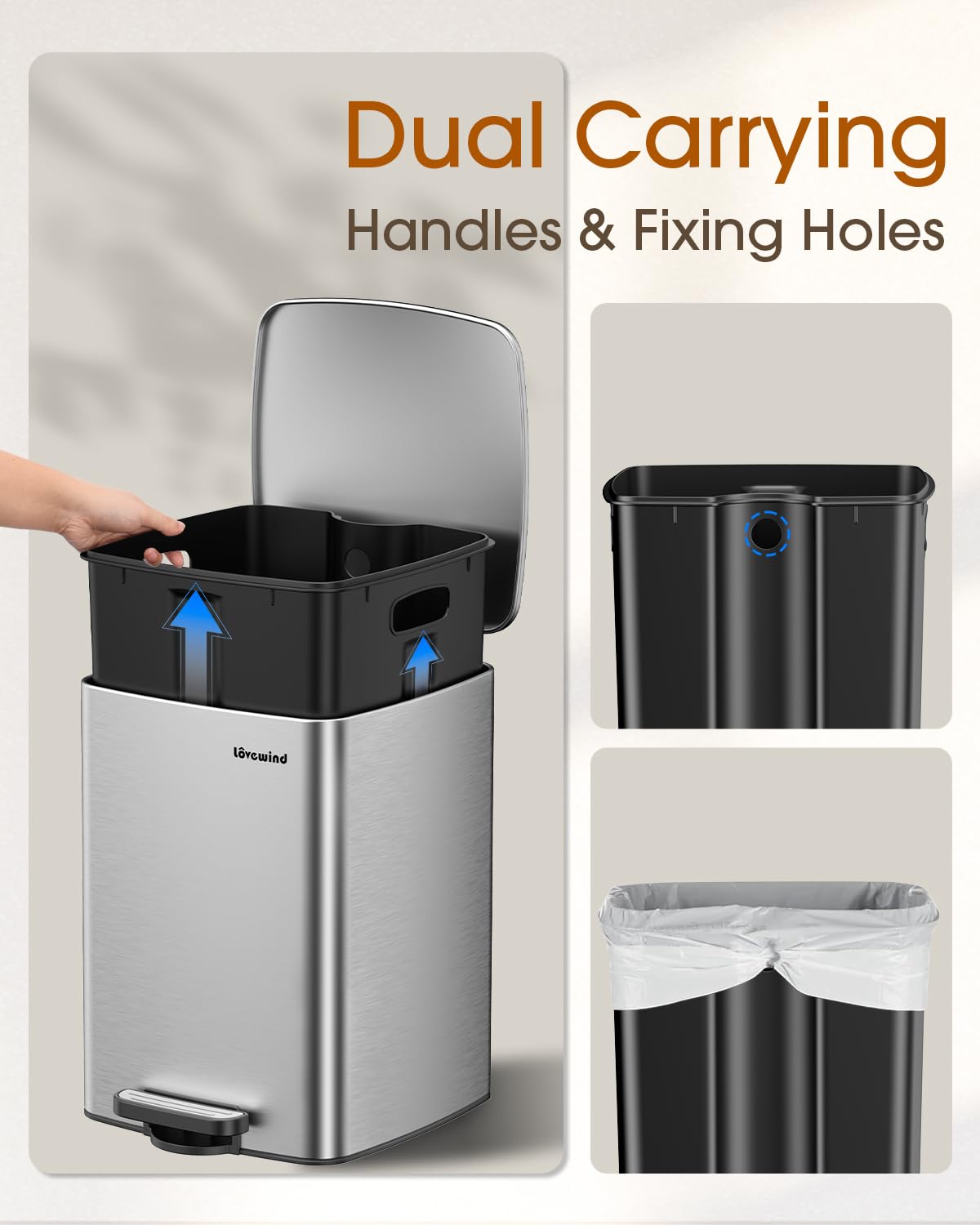 • Easy Cleaning: Removable inner bucket for easy cleaning and maintenance, keeping your kitchen waste bins fresh and odor-free