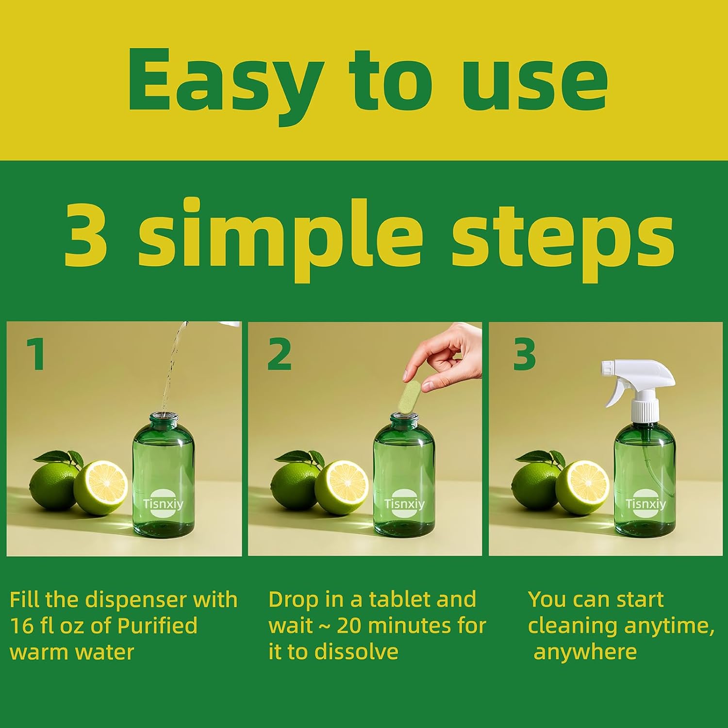 • Easy to Use: Our multi-surface cleaner tablet is a breeze. Simply drop a tablet into a spray bottle filled with water, wait for it to dissolve completely, and you're ready to tackle any cleaning task. The convenient tablet form makes storage and handling effortless, saving space in your cleaning cupboard too.
