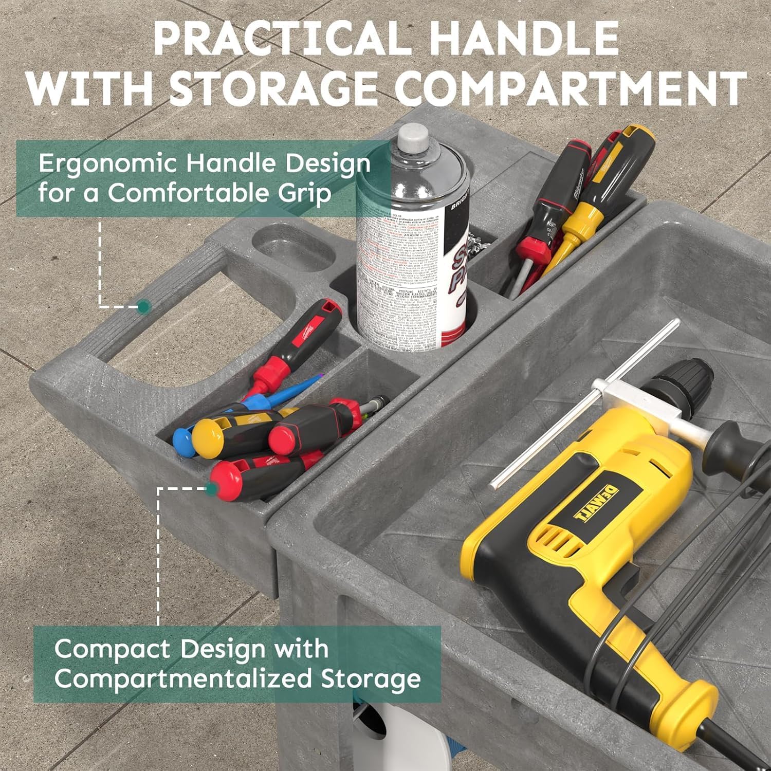 • 【Portable Design】Plastic utility service carts are equipped with ergonomic armrests that allow you to move with less effort and experience a comfortable grip. Modular storage compartments and small holes are designed to keep your tools handy and enhance your experience.