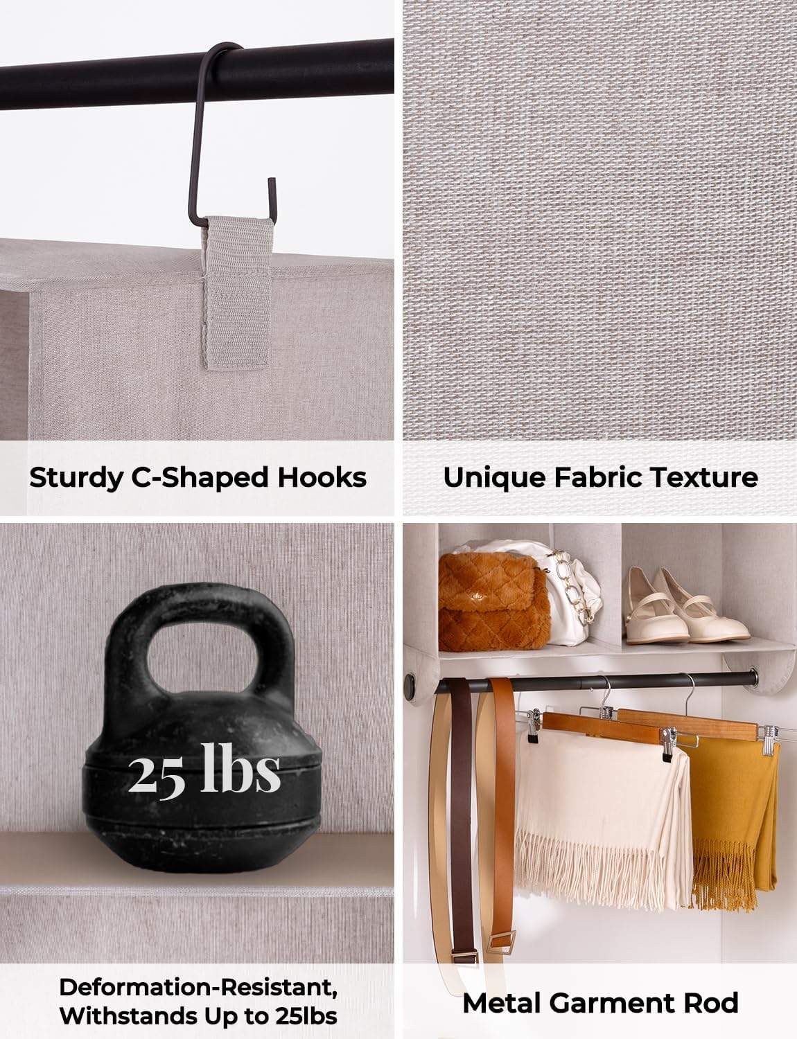 • Sturdy Closet Rod: Comes with a sturdy metal clothing rod that provides extra hanging space for sweaters, towels, scarves, shirts, dresses, pants, hats, shoes and handbags.