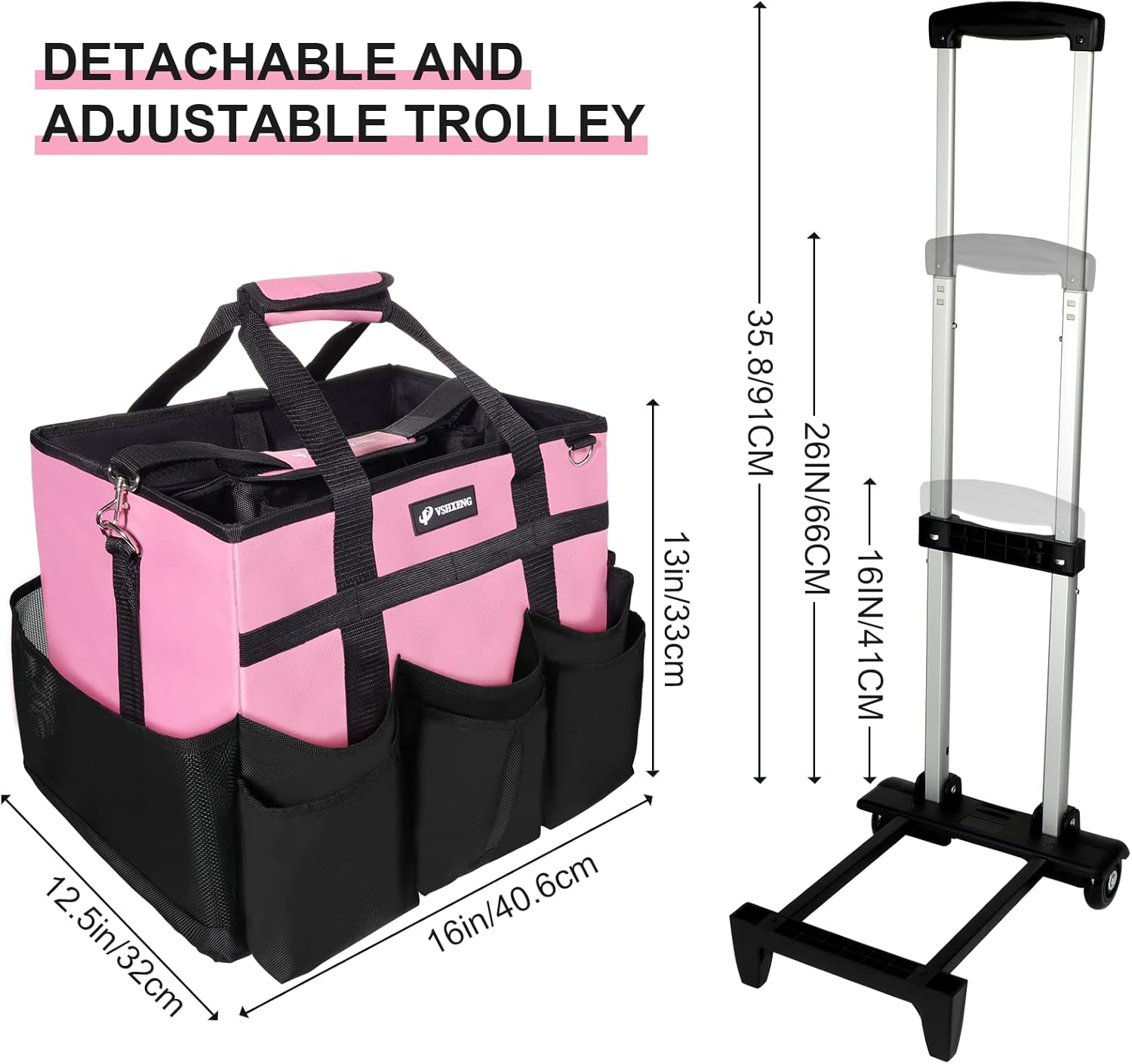 Large Rolling Cleaning Caddy Bag with Wheels, with Detachable Trolley, Cleaning Bags on Wheels for Housekeepers, Cleaning Cart Supplies Organizer for Home, Car, Picnic (Pink)