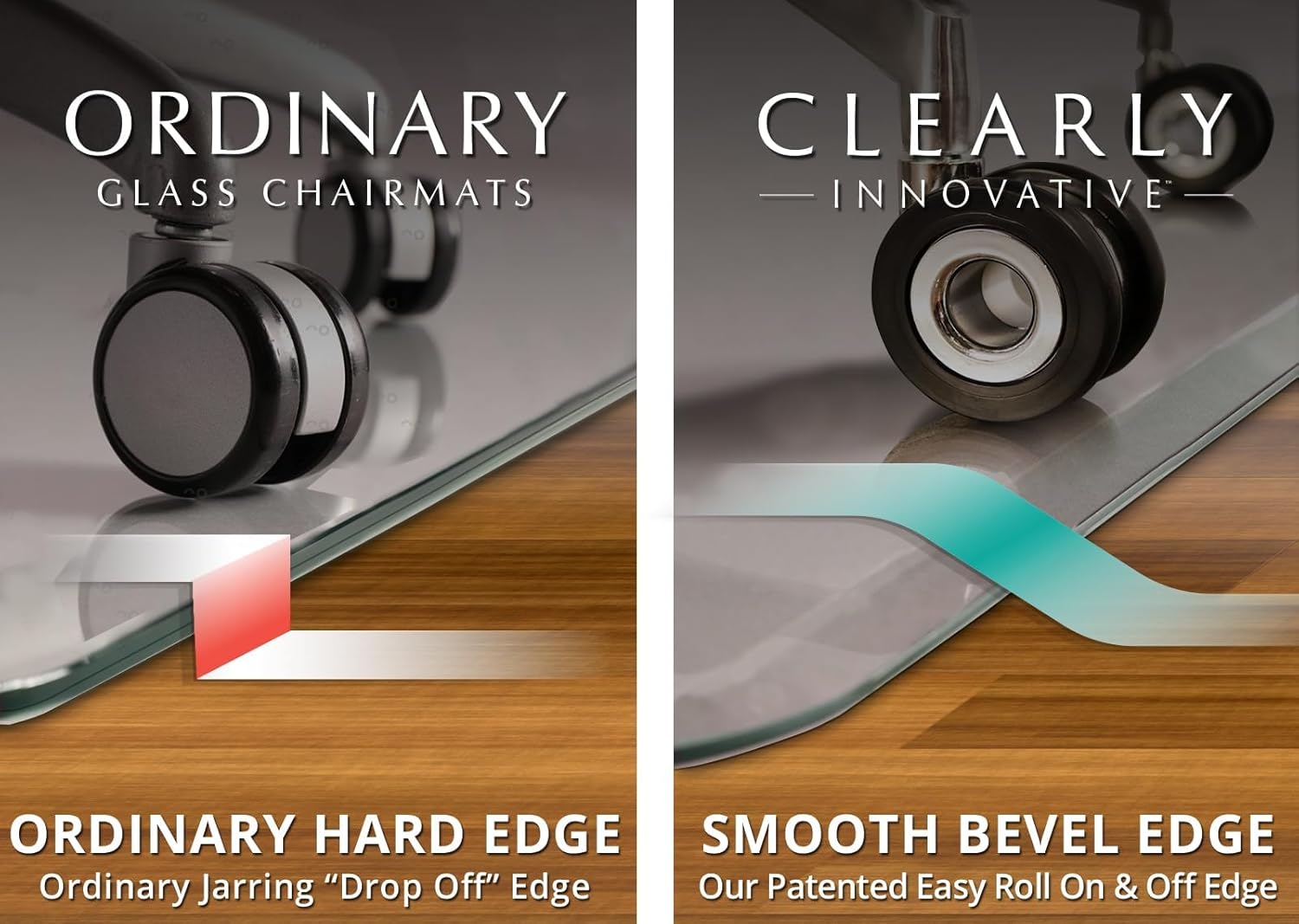 • 𝗣π—₯π—˜π— π—œπ—¨π—  π—–π—›π—”π—œπ—₯ 𝗠𝗔𝗧 - Clearly Innovative set out to create the best ¼” thick tempered glass chair mats on the market and have done so with their exclusive patented beveled-edge design that provides a smooth transition from our premium glass mat to carpet or hard floors and is matched by no other manufacturer.