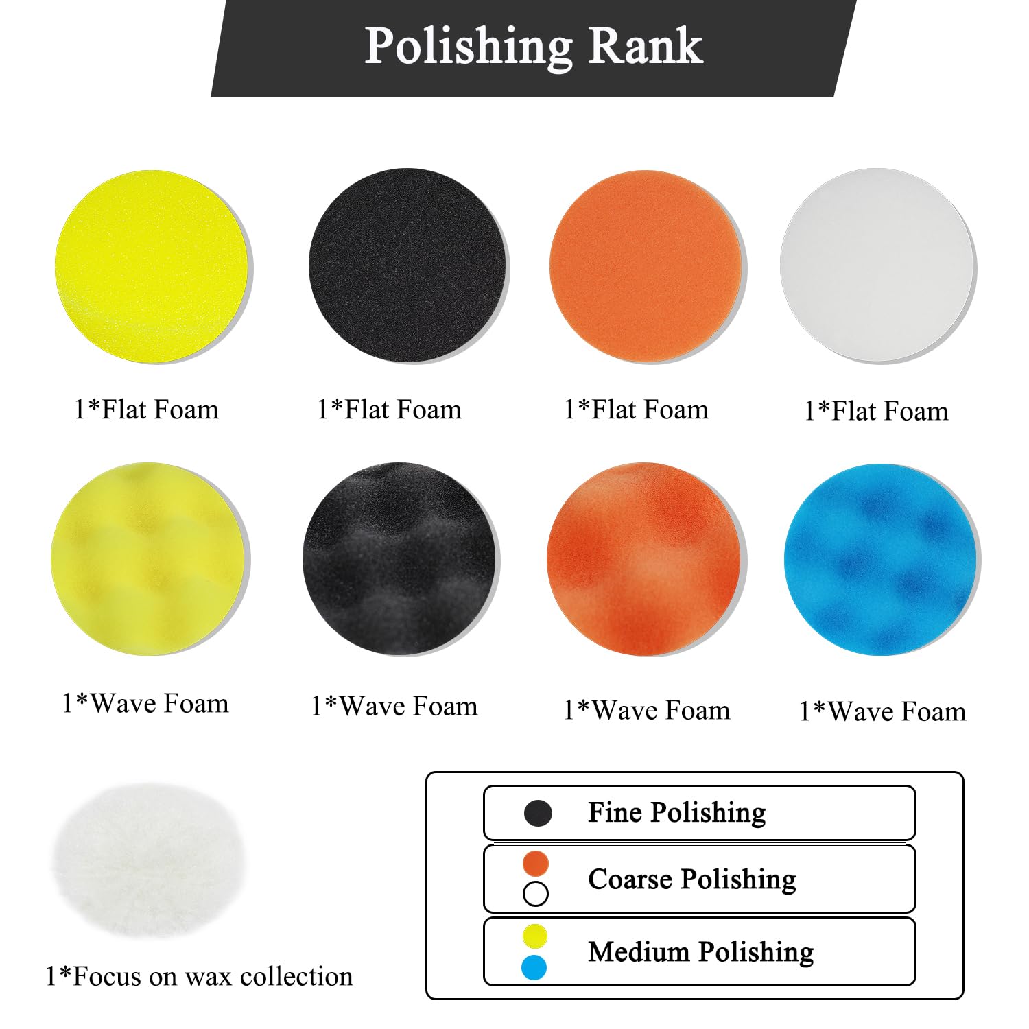 • Car Polishing Buffing Kit,11 Pcs Car Foam Polishing Pads Kit,8 pcs 3" Sponge Polishing Pads, 1 pcs Wool Buffing Pad,1 pcs Drill Adapter,1 pcs Suction Cup