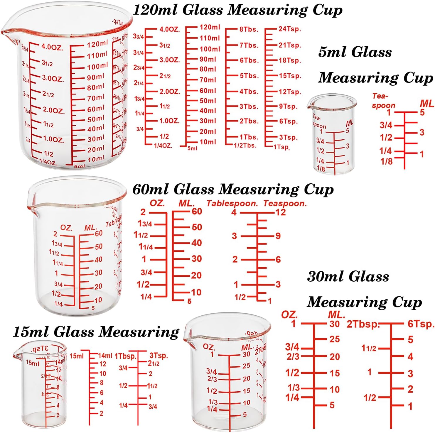 • Complete Measuring Beaker Set – Includes 7 glass beaker measuring cups: 1 tsp (5ml), 1 tbsp (15ml), 1oz (30ml), 2oz (60ml), 4oz (120ml), 5oz (150ml), and 8oz (250ml), covering all baking, cooking, and drink preparation needs